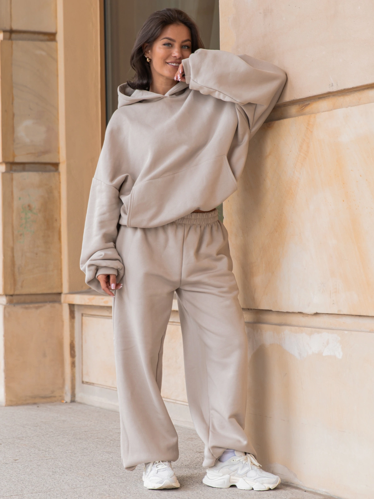 Stonowane kolory i prosty krój sprawiają, że spodnie można łatwo łączyć z różnymi elementami garderoby – od casualowych T-shirtów i bluz, po bardziej eleganckie dodatki, tworząc efekt sportowej elegancji. Delikatne przeszycia oraz praktyczne kieszenie podkreślają uniwersalny charakter spodni, dodając im jednocześnie subtelnego wyrazu i funkcjonalności.