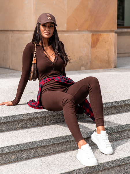 Obcisły bawełniany KOMBINEZON z dzianiny prążkowanej zapinany na guziki z kołnierzykiem czekoladowy X316