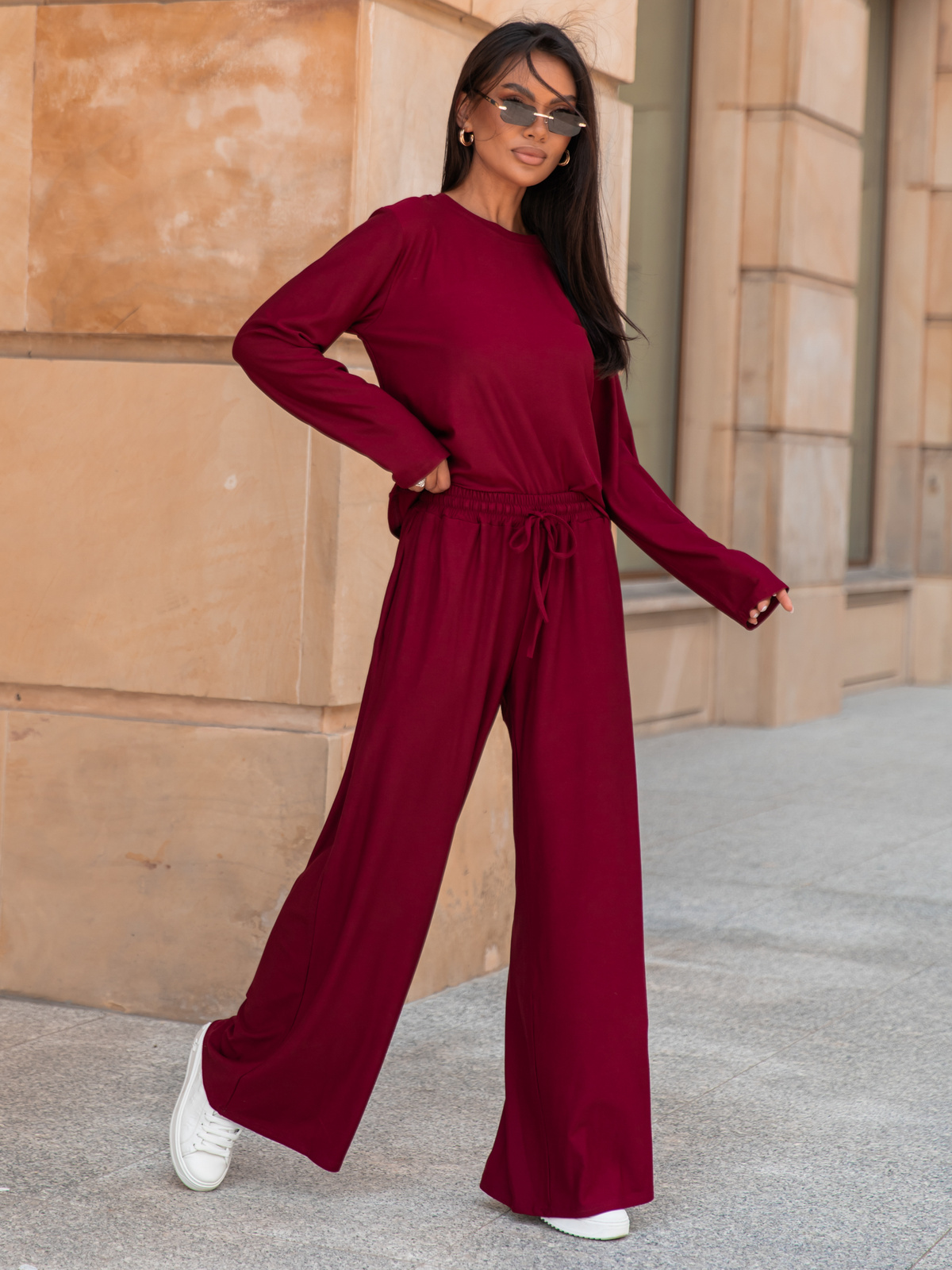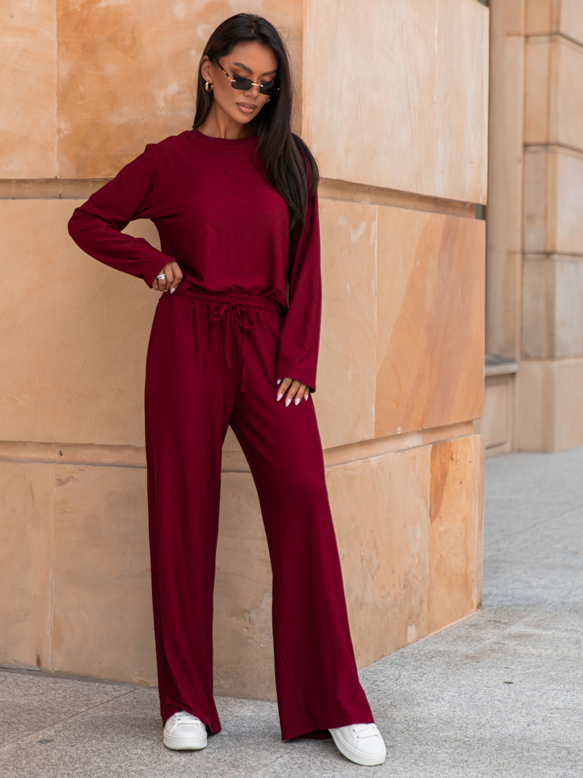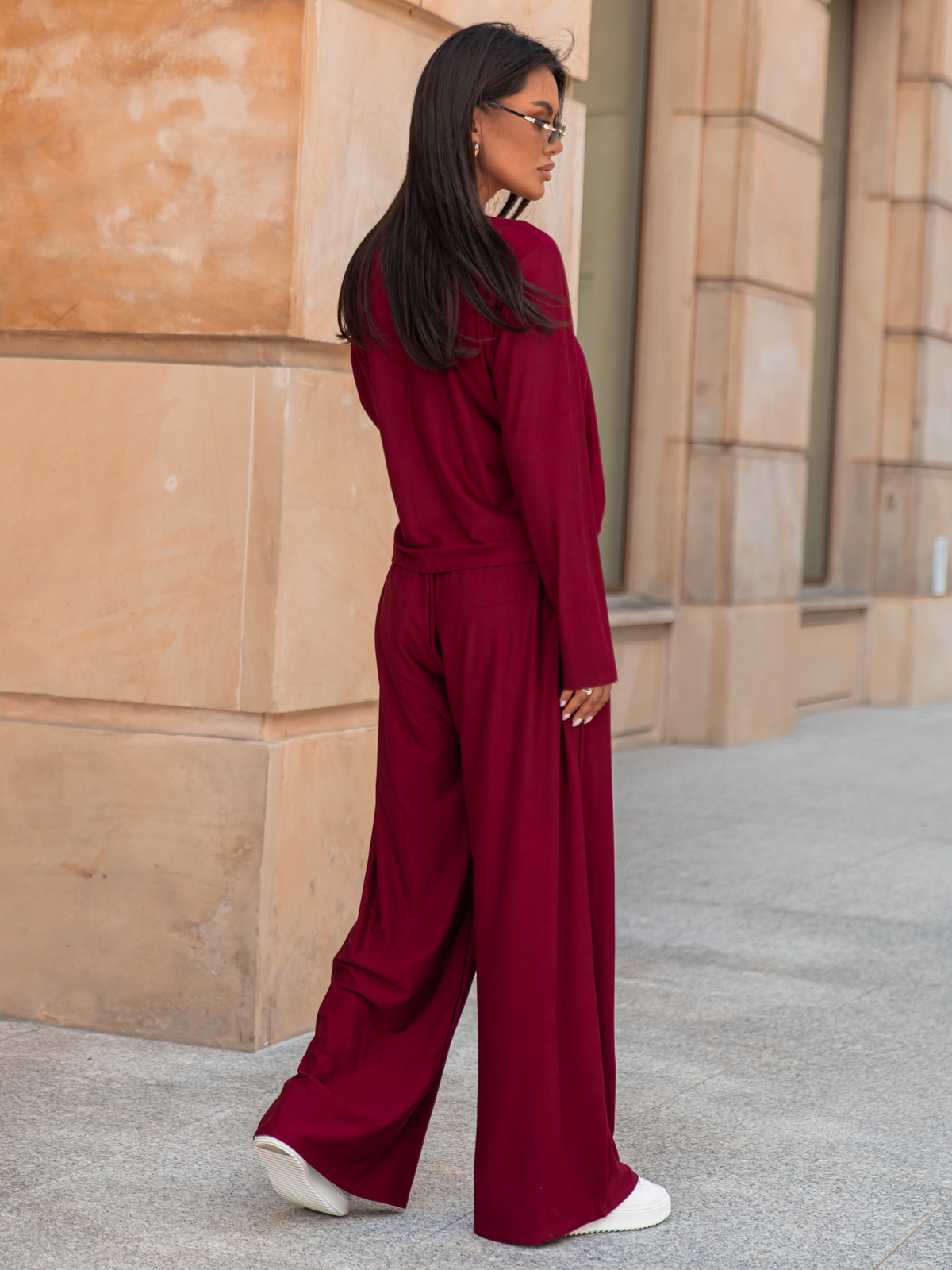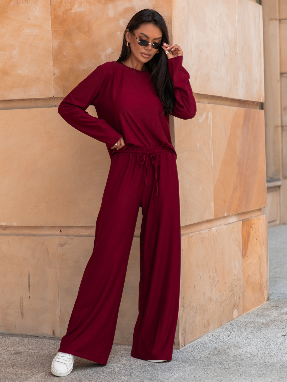 Ten zestaw z naturalnej wiskozy to idealne połączenie komfortu, swobody i stylu na co dzień. Składa się z luźnego t-shirtu typu oversize z długim rękawem oraz szerokich spodni z wysokim stanem – całość tworzy wygodny komplet w sportowo-casualowym stylu.