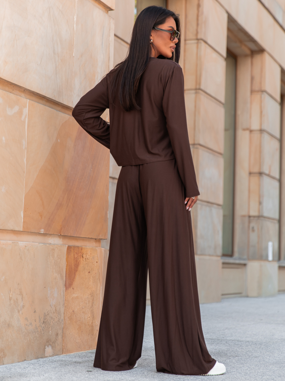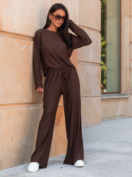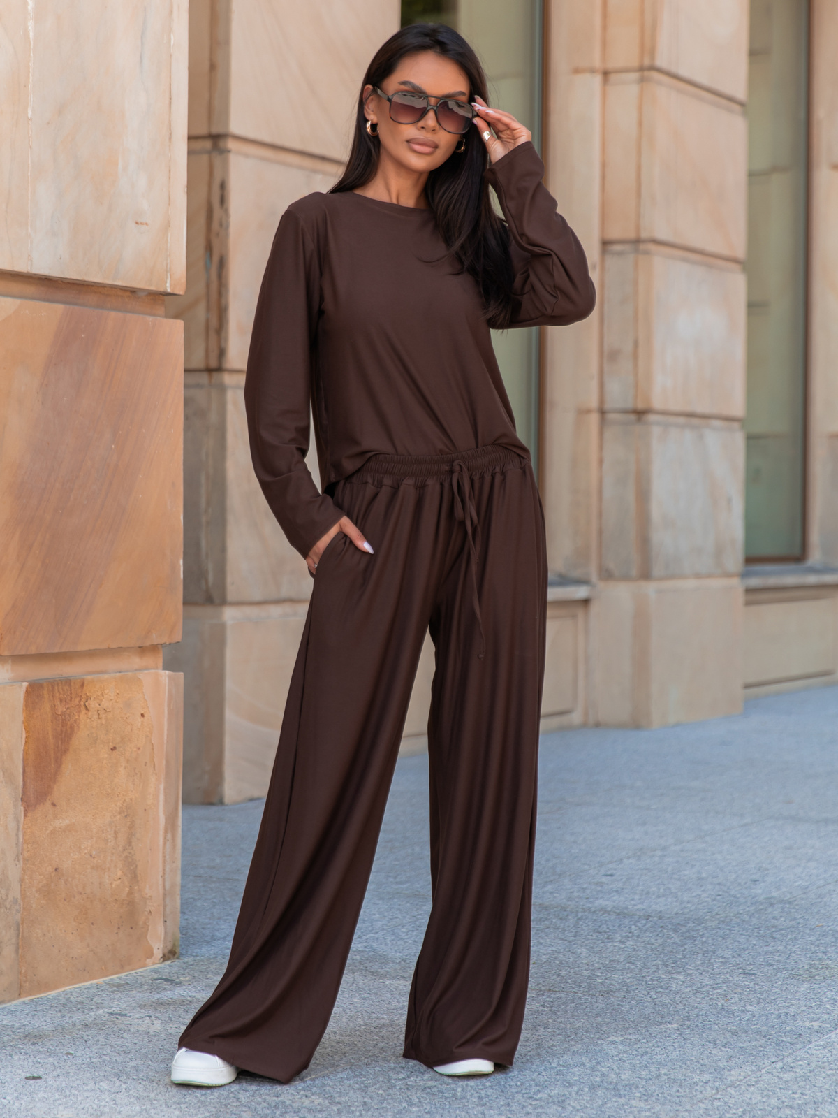 Codzienny komfortowy KOMPLET z wiscozy luźna bluzka z długim rękawem i szerokie spodnie czekoladowy X318