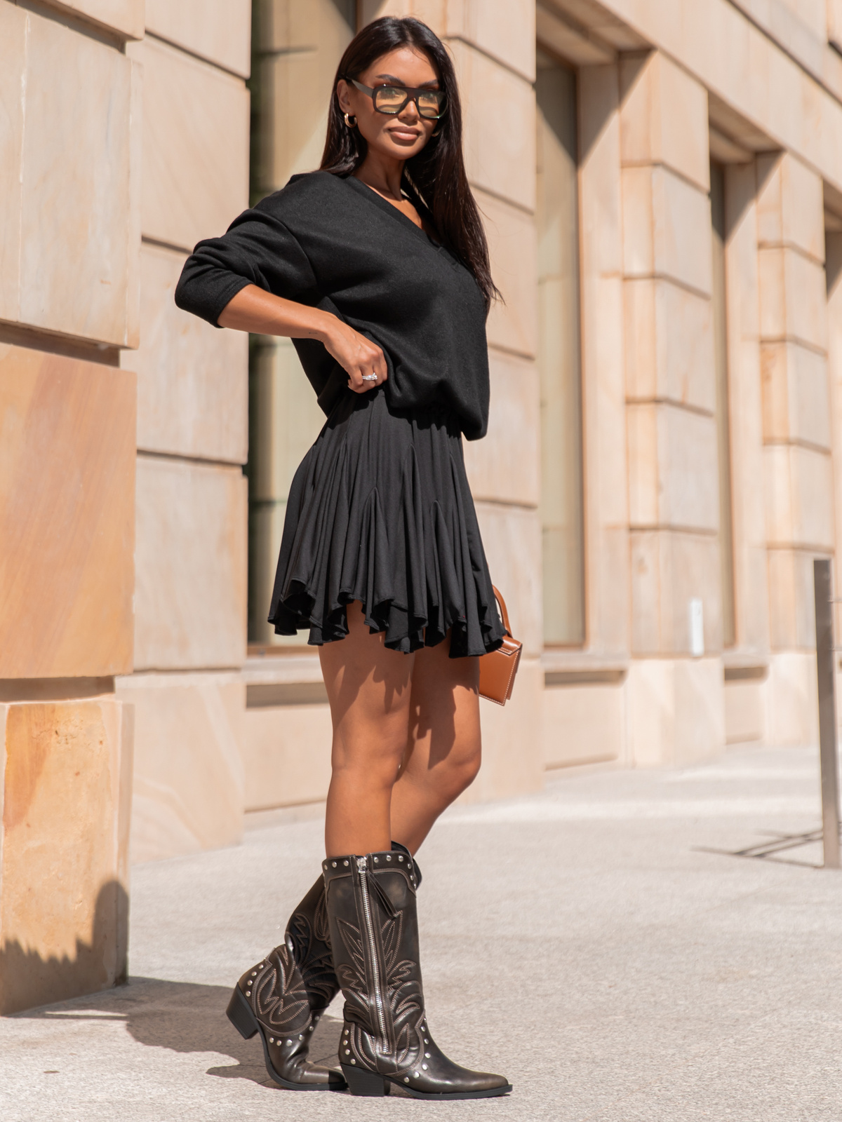 Do tego rozkloszowana spódnica z asymetrycznym dołem wprowadza lekkość i subtelną dynamikę, gwarantując pełen komfort przez cały dzień. Ten harmonijny komplet świetnie sprawdzi się na co dzień, jak i podczas wyjątkowych okazji, doskonale łącząc się z dżinsami, legginsami czy dopasowanymi bluzkami.