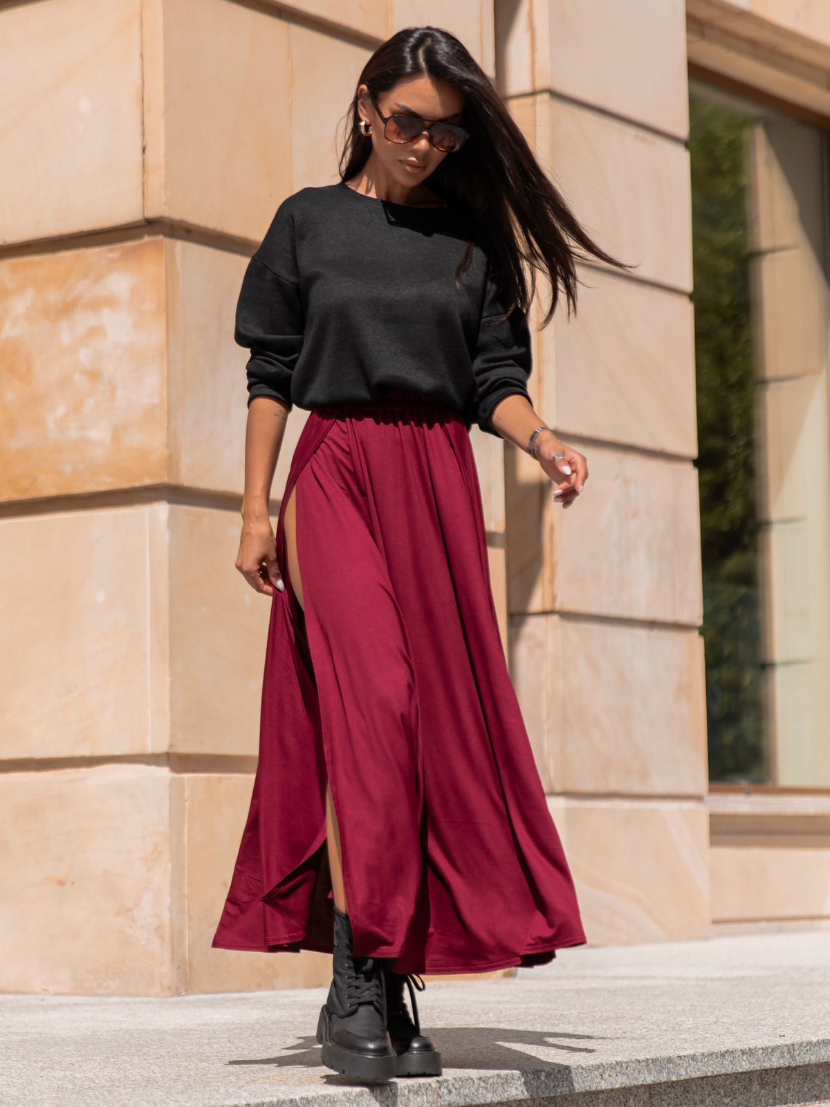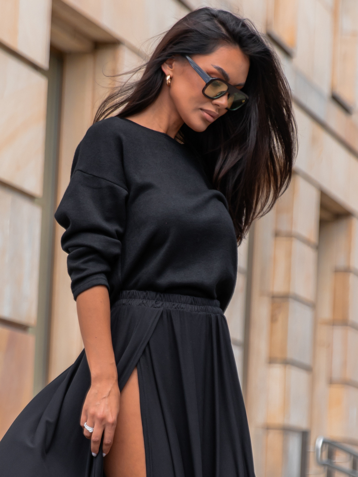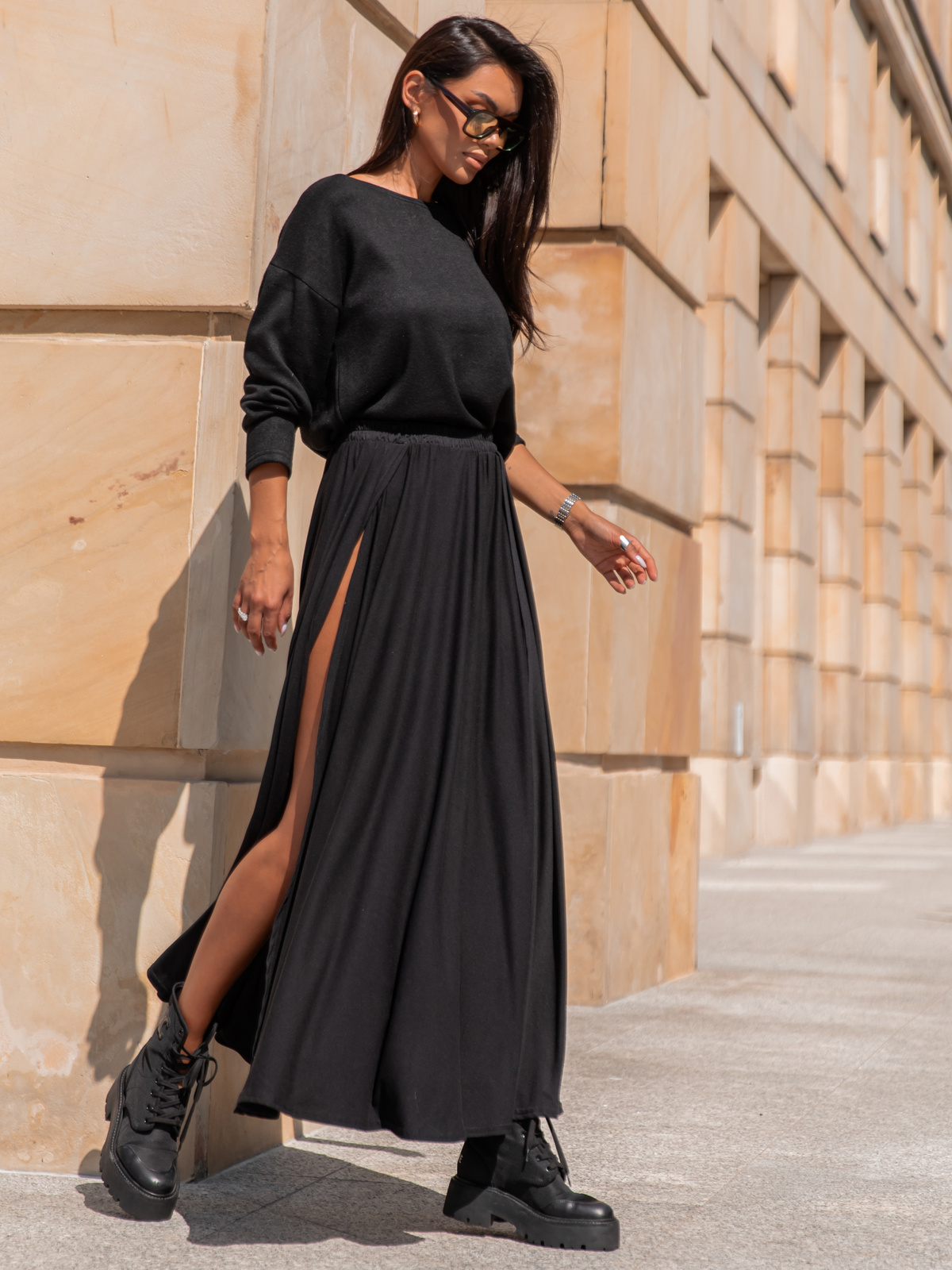 Do tego rozkloszowana spódnica maxi z rozcięciami z przodu wprowadza lekkość i dynamikę, a elastyczny, przyjemny w dotyku materiał gwarantuje komfort przez cały dzień. Zestaw świetnie komponuje się z dżinsami, legginsami lub innymi elementami garderoby, tworząc harmonijną i stylową całość.