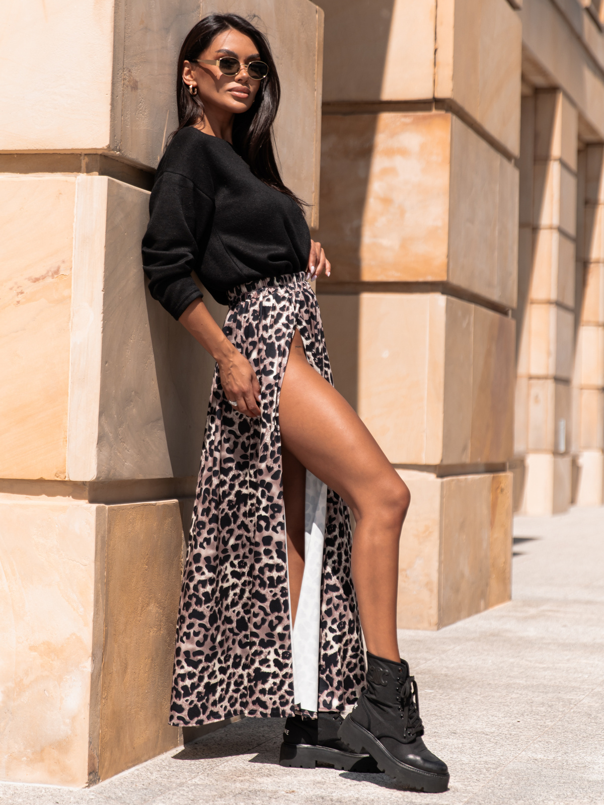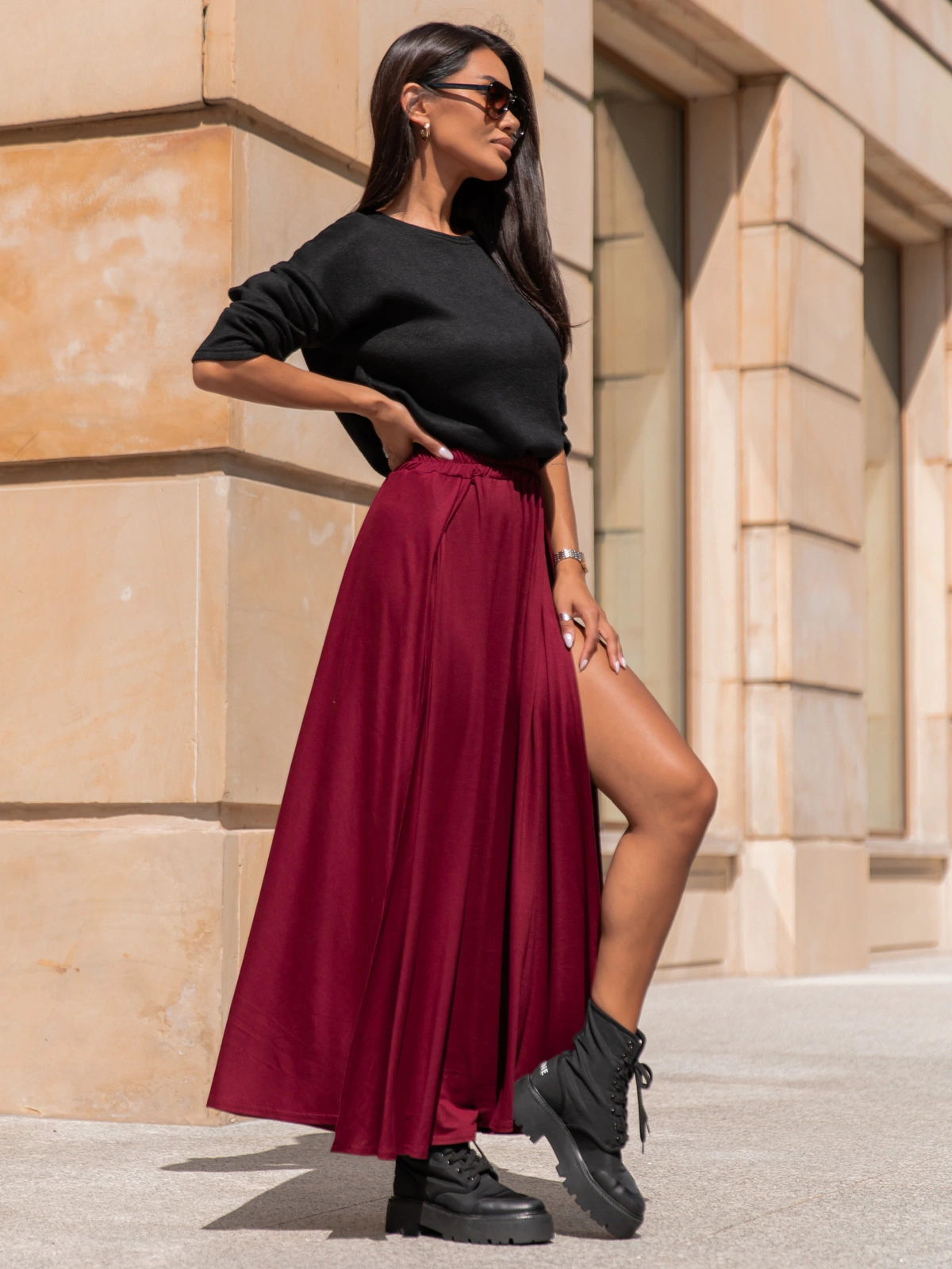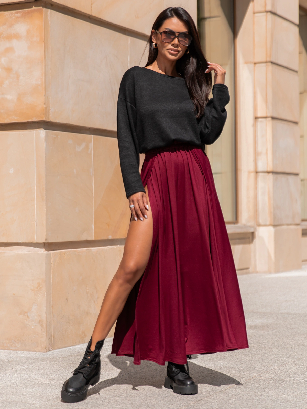 Do tego rozkloszowana spódnica maxi z rozcięciami z przodu wprowadza lekkość i dynamikę, a elastyczny, przyjemny w dotyku materiał gwarantuje komfort przez cały dzień. Zestaw świetnie komponuje się z dżinsami, legginsami lub innymi elementami garderoby, tworząc harmonijną i stylową całość.