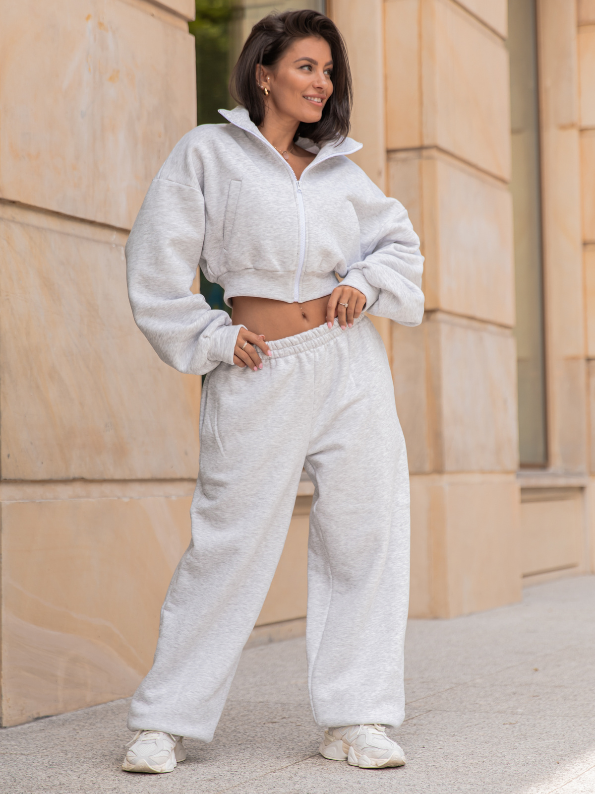 Bluza wyróżnia się minimalistycznym krojem i wygodnym zapięciem na zamek, które pozwala na szybkie zakładanie i regulację stylu. Spodnie baggy, dzięki elastycznym wykończeniom, dopasowują się do sylwetki, a praktyczne kieszenie oraz delikatne przeszycia dodają im funkcjonalności i charakteru.