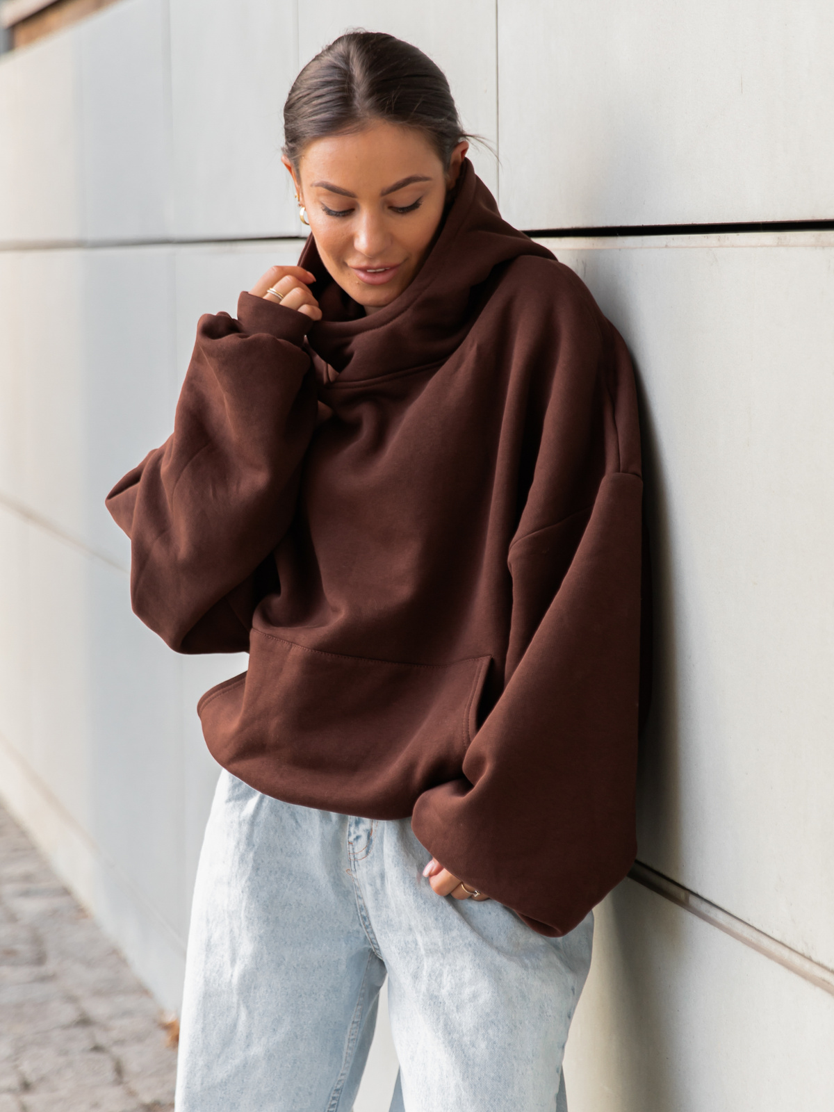 Viralowa Bawełniana BLUZA z drapanego dresu z kapturem na stójce z kieszeniami kangurka brązowa E1