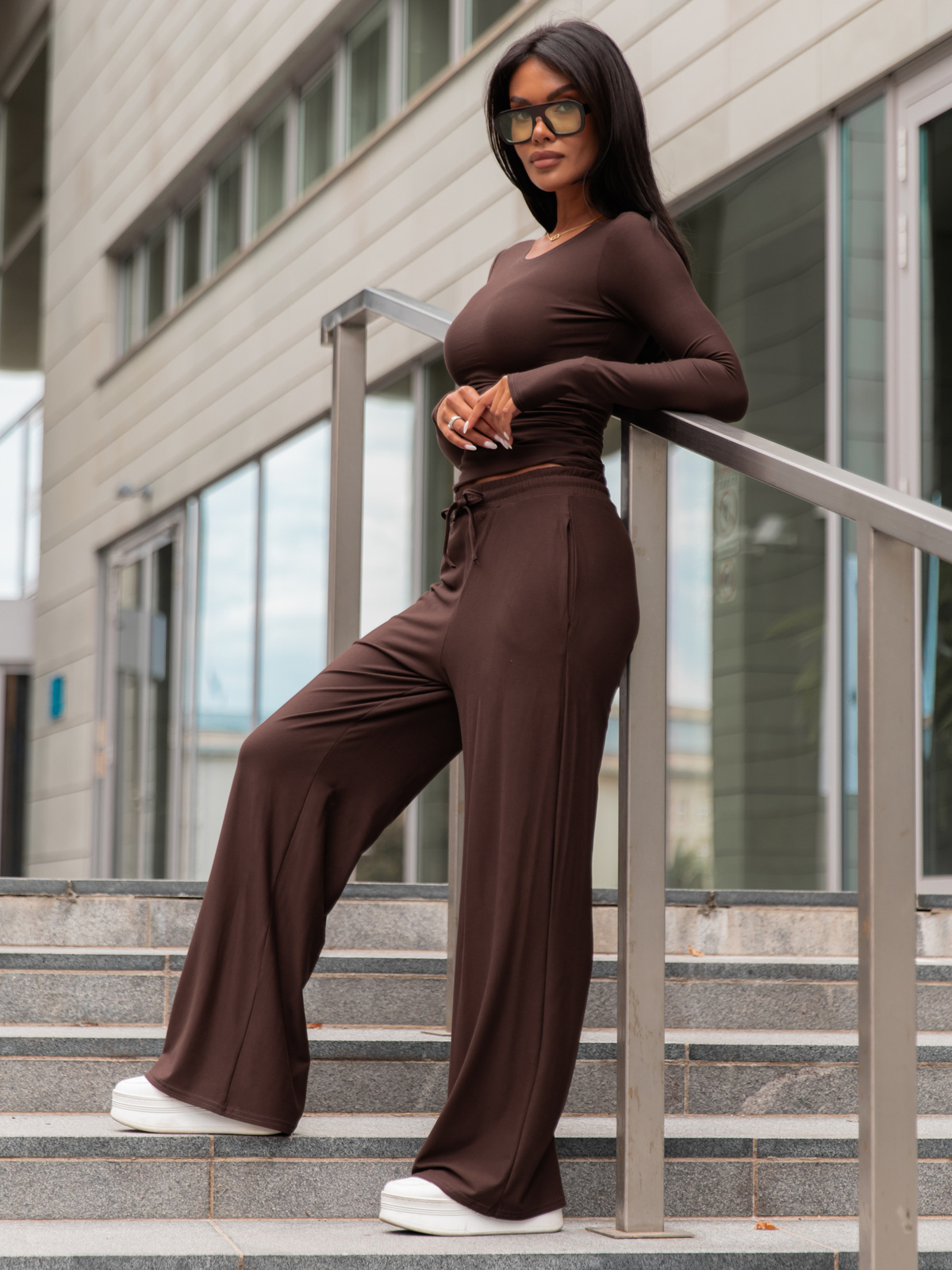 Wiskozowy KOMPLET dopasowana bluzka z długim rękawem i luźne spodnie czekoladowy E351