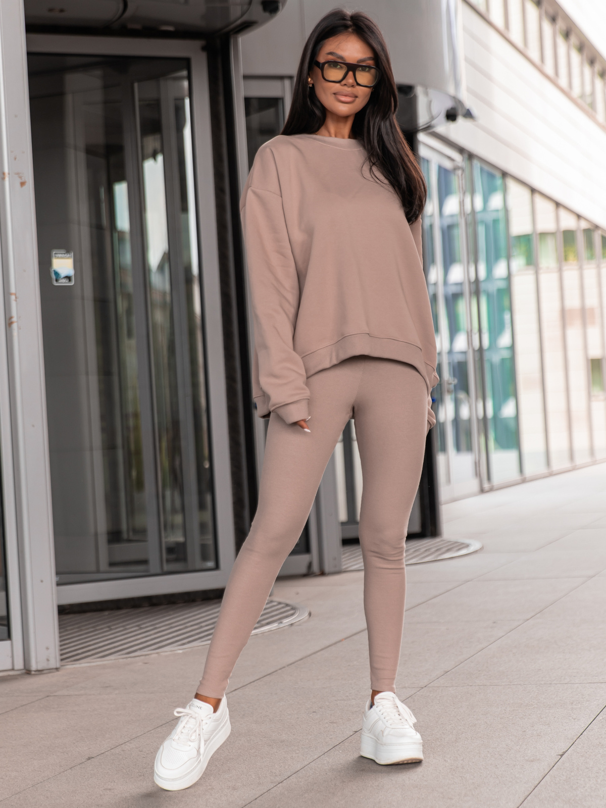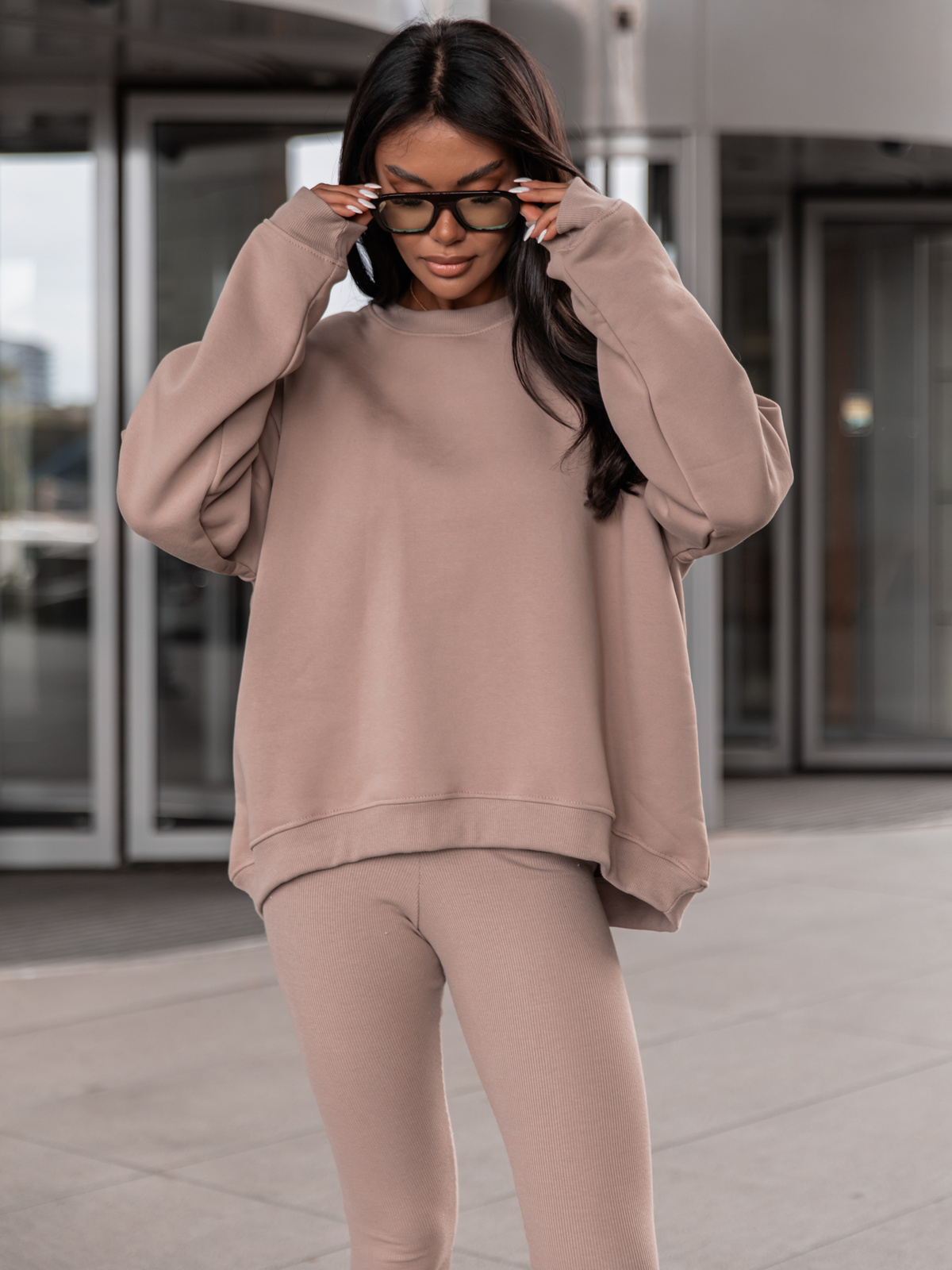 Bawełniany KOMPLET asymetryczna dresowa oversizowa bluza bez kaptura i spodnie legginsy z prążkowanej dzianiny mokka X351