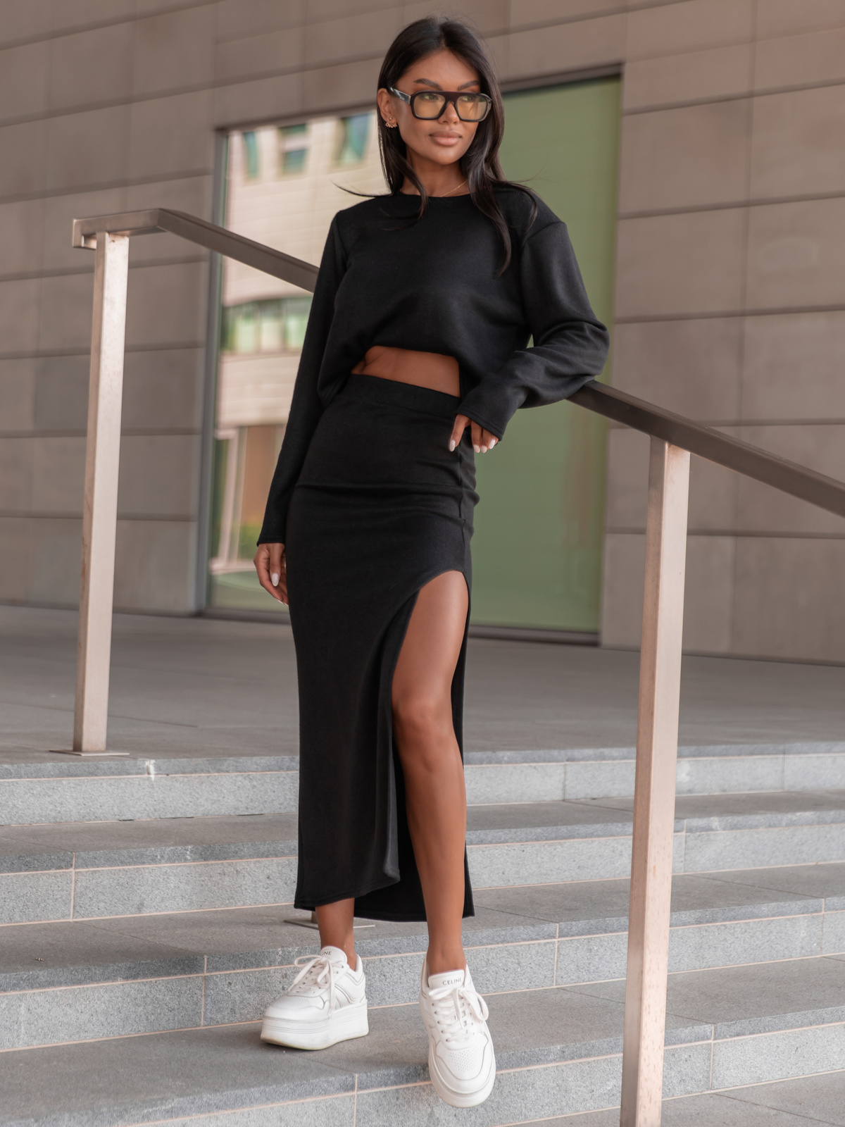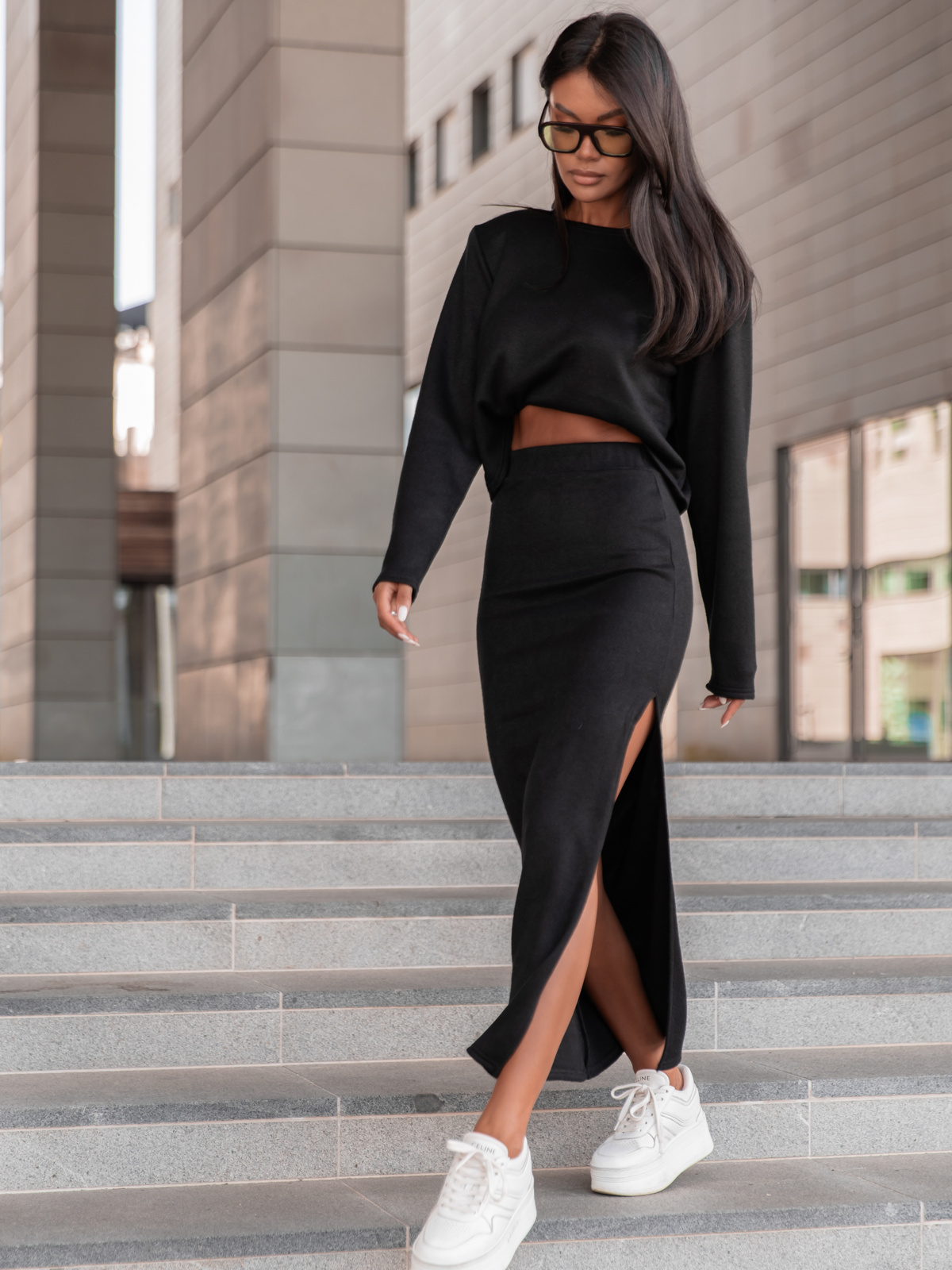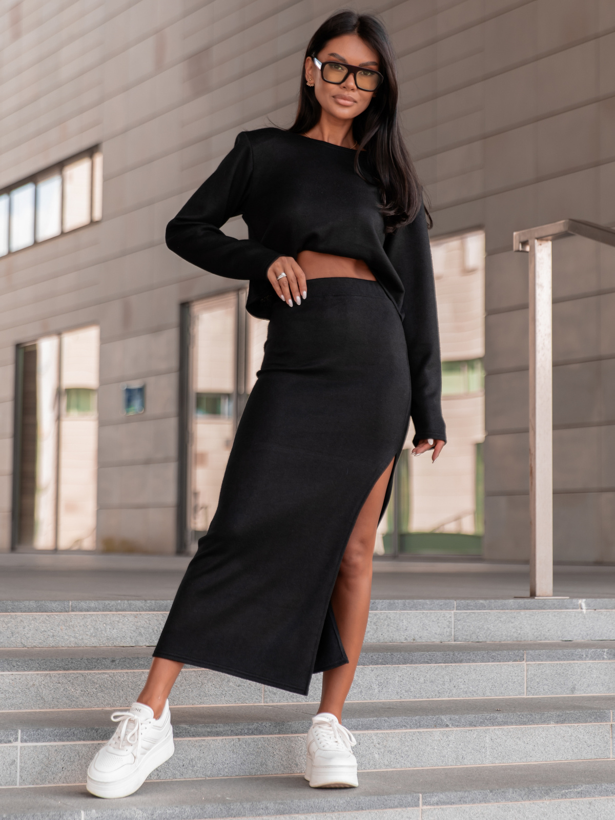 Swetrowy KOMPLET luźna bluzka z poduszkami i spódnica długość maxi z rozporkiem czarny X352