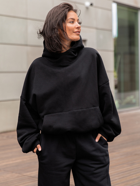 Viralowa Bawełniana BLUZA z drapanego dresu z kapturem na stójce z kieszeniami kangurka czarny E1