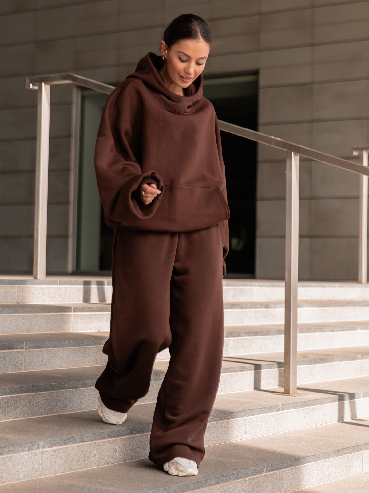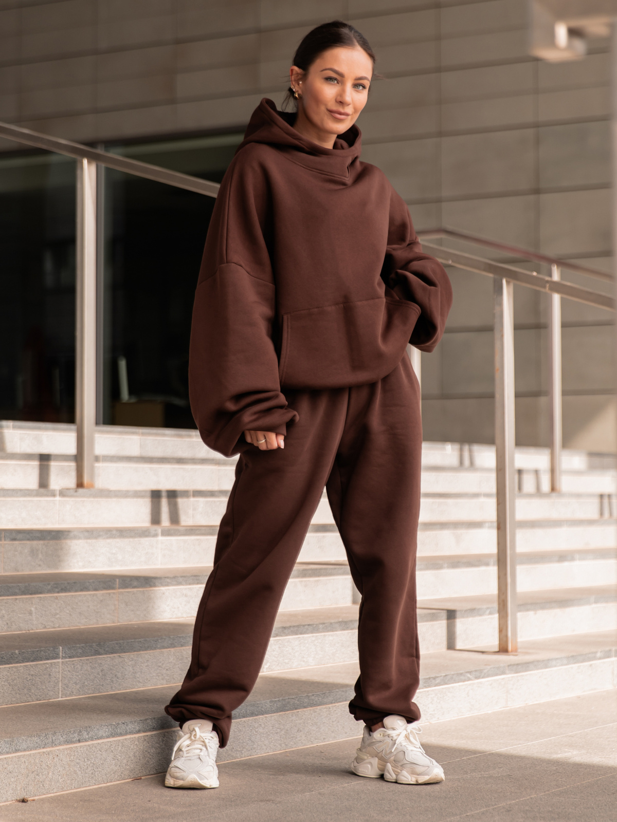Viralowa Bawełniana BLUZA z drapanego dresu z kapturem na stójce z kieszeniami kangurka brązowa E1