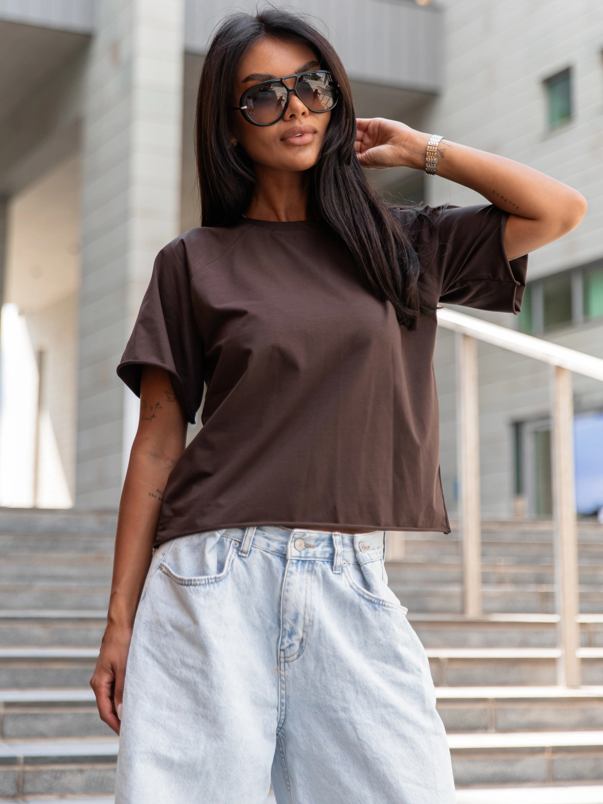 Nowoczesny fason, który łączy wygodę z modnym wykończeniem. Swobodny, krótszy krój doskonale komponuje się ze spodniami i spódnicami z wysokim stanem, podkreślając sylwetkę i dodając lekkości stylizacji. Surowe wykończenia mankietów i dołu bluzki, które naturalnie delikatnie się zwijają, nadają całości efektu „niedbałej elegancji” i modnego, casualowego charakteru.