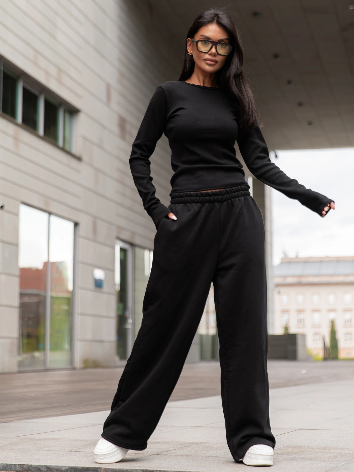 ZESTAW Basic: Bawełniana BLUZKA z prążkowanej dzianiny X355 + Dresowe SPODNIE z szerokimi nogawkami X31