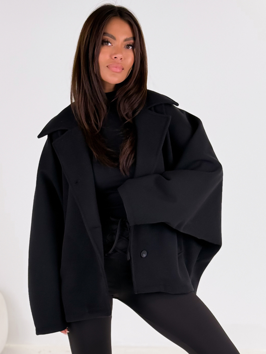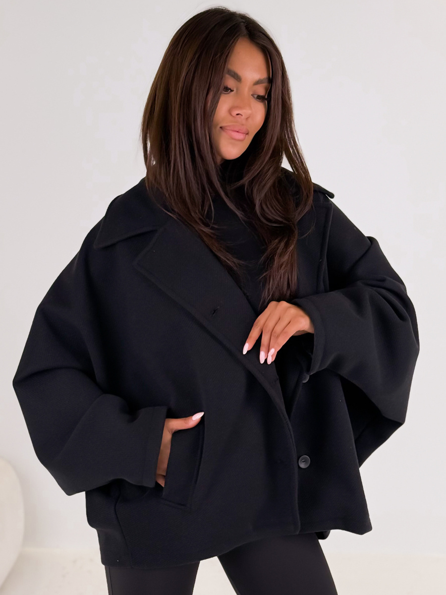 Oversizowy krótki PŁASZCZ KURTKA o szerokim kroju czarny E515