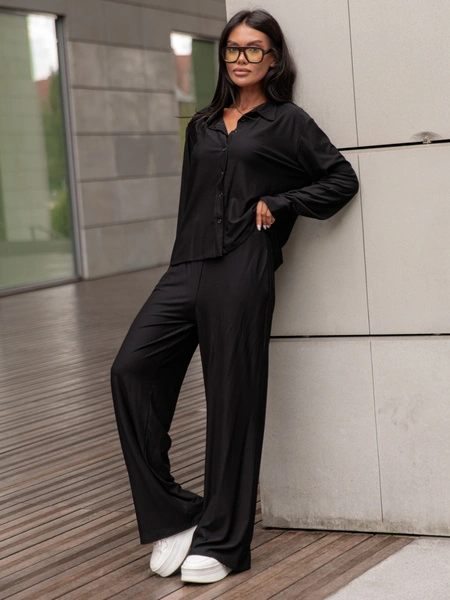 Wiskozowy codzienny KOMPLET lużna bluzka o kroju koszuli i luźne spodnie czarny X357 k01