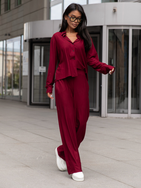 Wiskozowy codzienny KOMPLET lużna bluzka o kroju koszuli i luźne spodnie bordowy X357 k01
