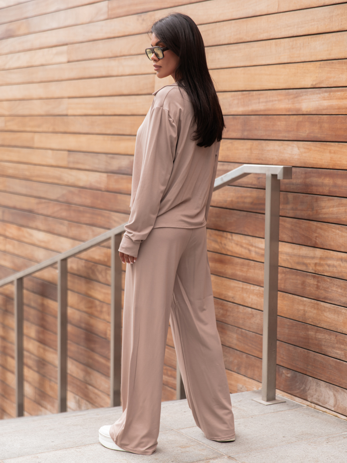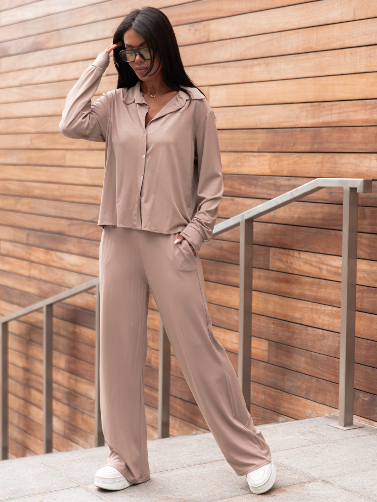 Wiskozowy codzienny KOMPLET lużna bluzka o kroju koszuli i luźne spodnie mokka X357