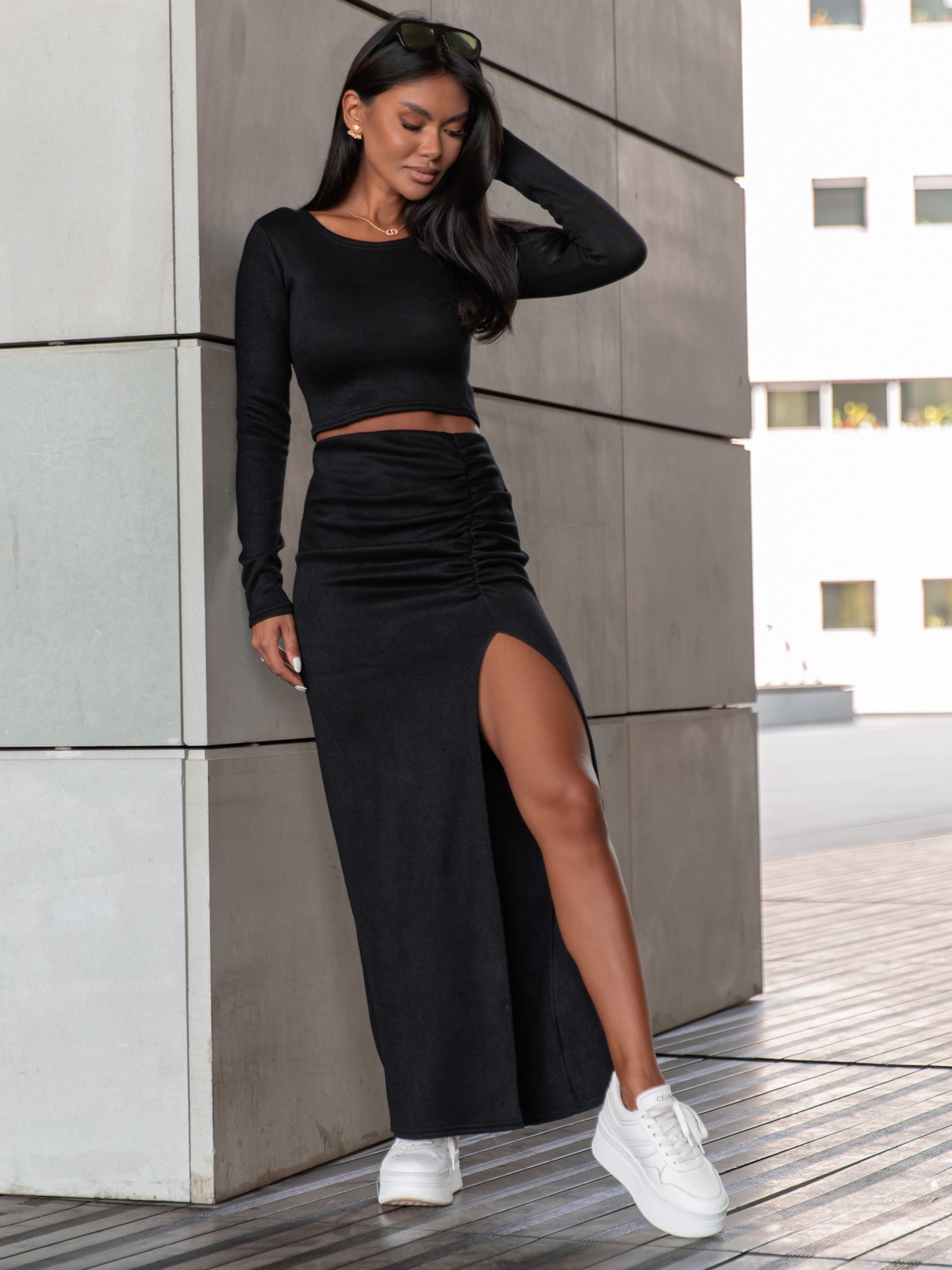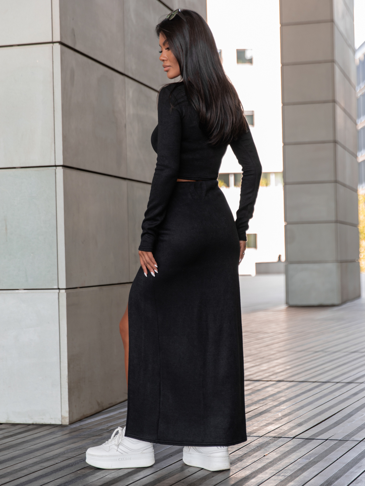 Komplet: dopasowany krótszy sweter z długim rękawem i spódnica maxi z rozcięciem i drapowaniem. Uszyty z dzianiny swetrowej, bardzo przyjemna w noszeniu, elastyczna.