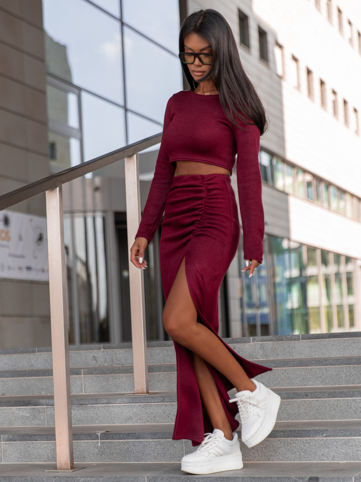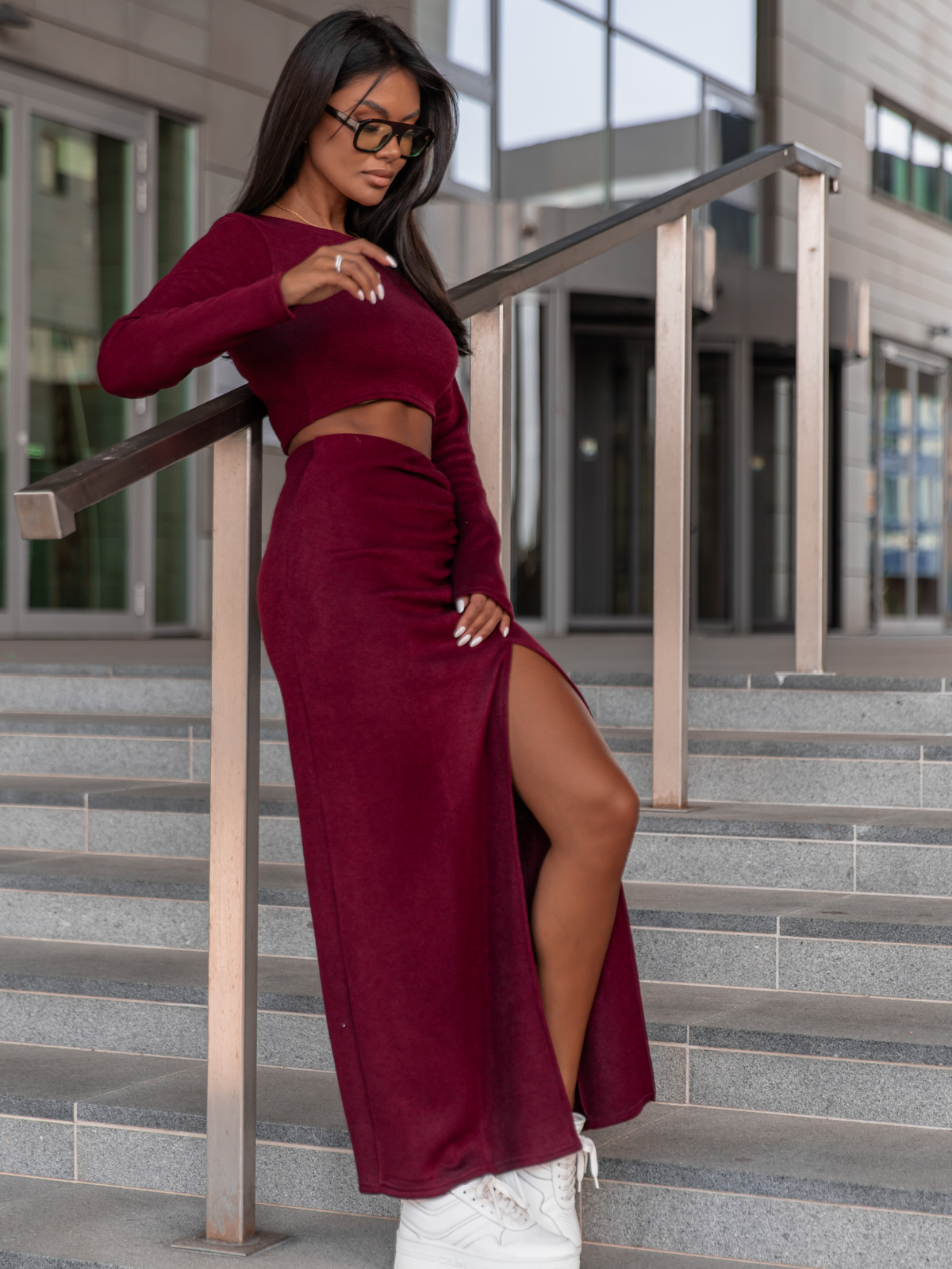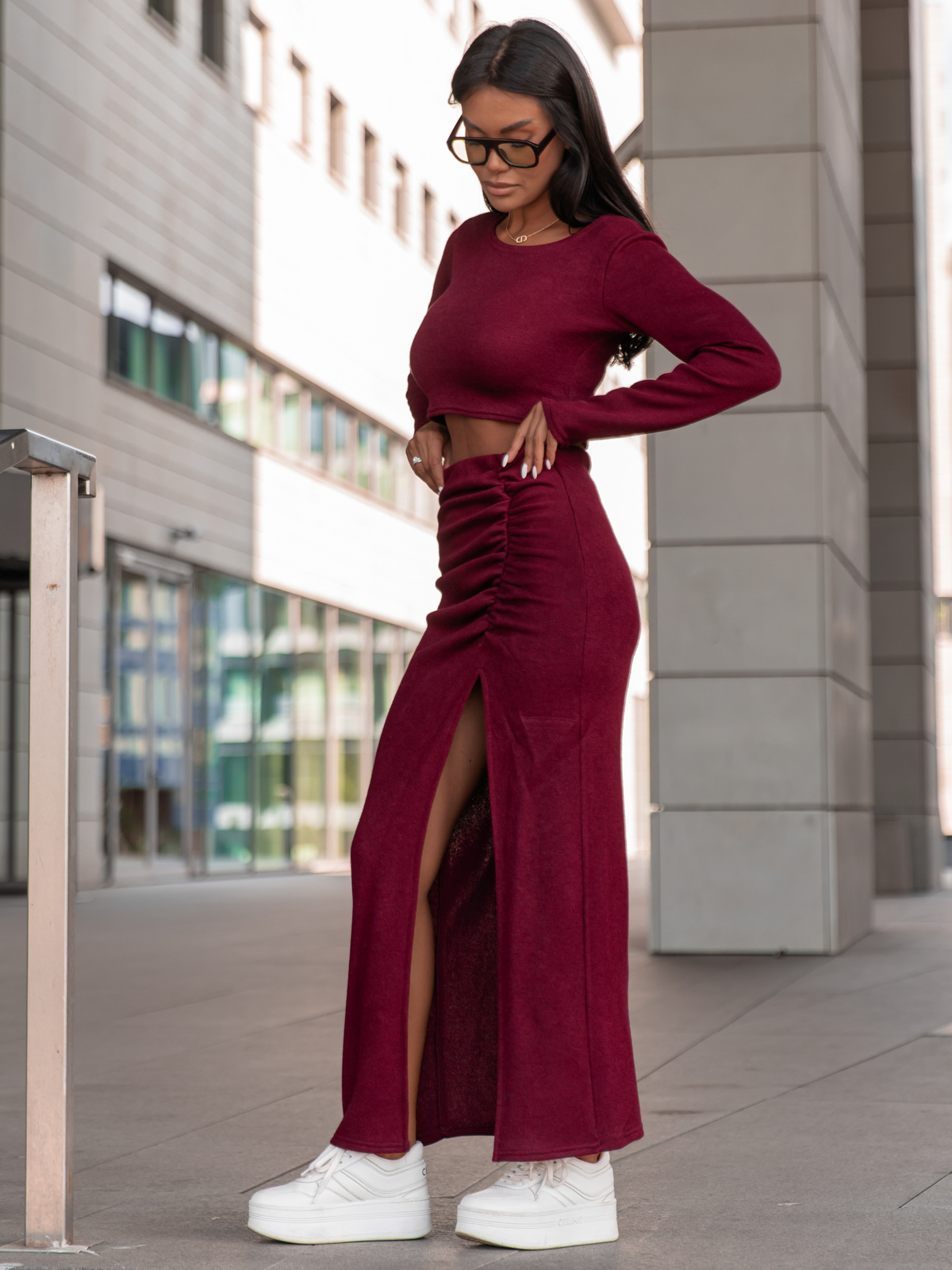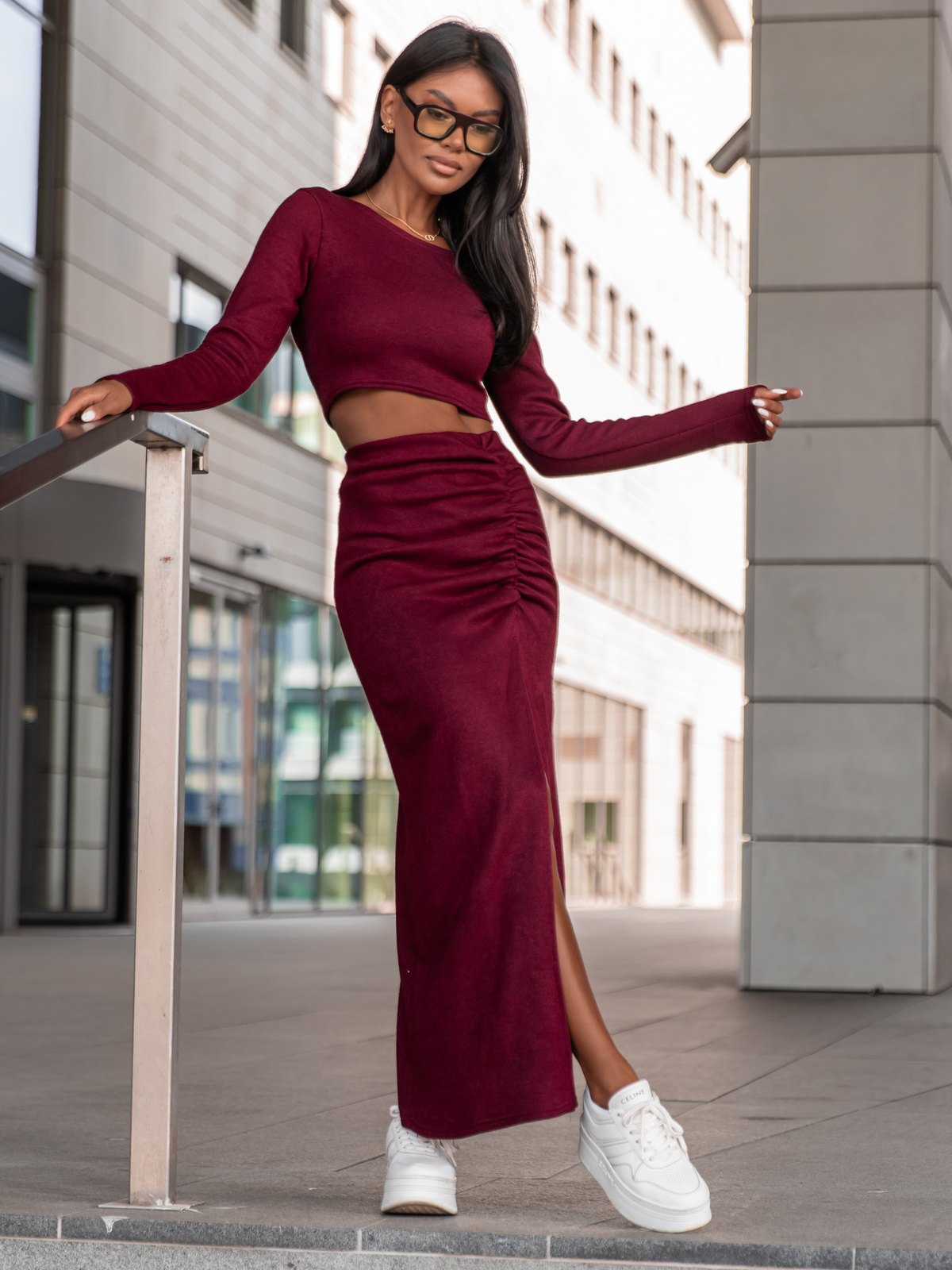 Swetrowy KOMPLET dopasowana bluzka i drapowana spódnica maxi bordowy X358