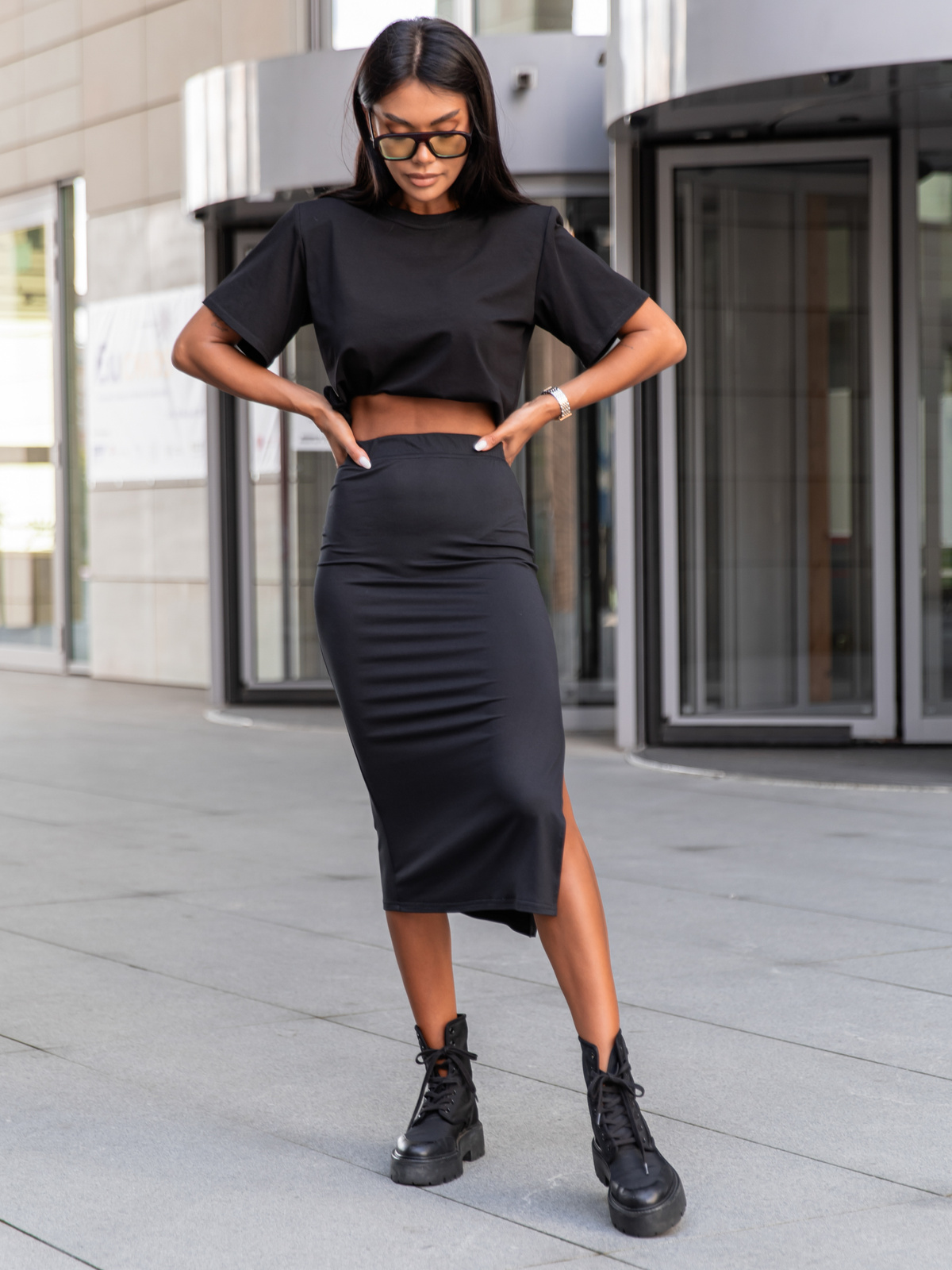 Obcisła spódnica o długości midi to kwintesencja kobiecej elegancji i nowoczesnego stylu. Zaprojektowana tak, aby podkreślać sylwetkę, idealnie dopasowuje się do ciała, dzięki czemu zapewnia zarówno wygodę, jak i efektowny wygląd. Spódnica została wyposażona w praktyczny rozporek, który nie tylko dodaje jej charakteru, ale także zwiększa swobodę ruchów.