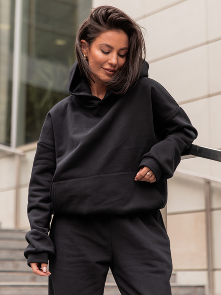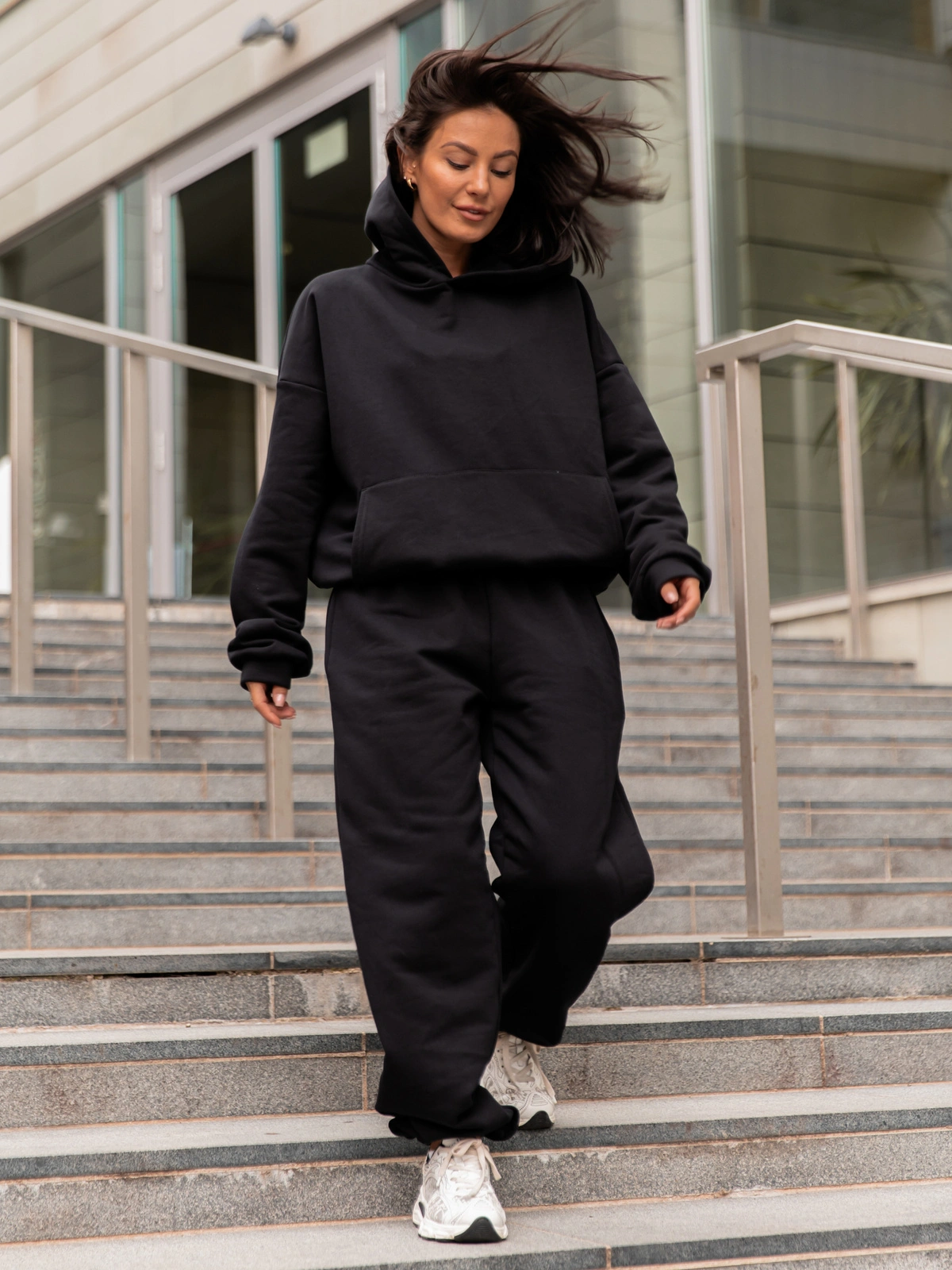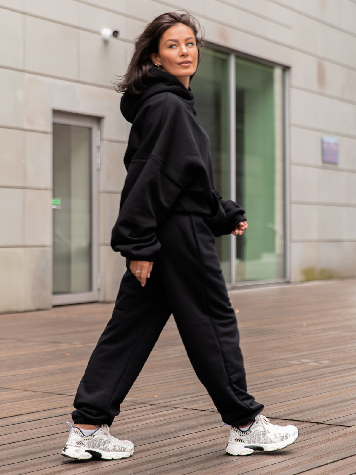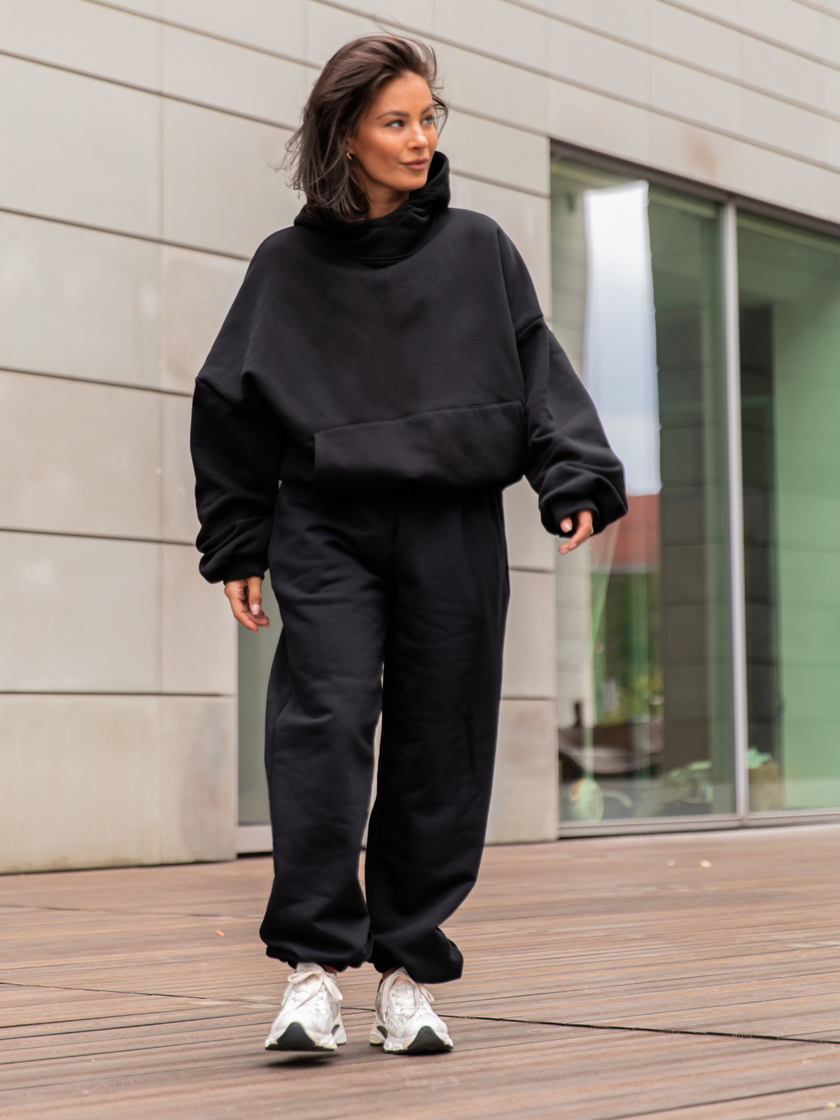 W skład kompletu wchodzi bluza typu kangurka z kapturem oraz spodnie ze ściągaczami w pasie i przy nogawkach. To połączenie tworzy idealny balans pomiędzy sportową wygodą a ponadczasową elegancją w casualowym wydaniu.