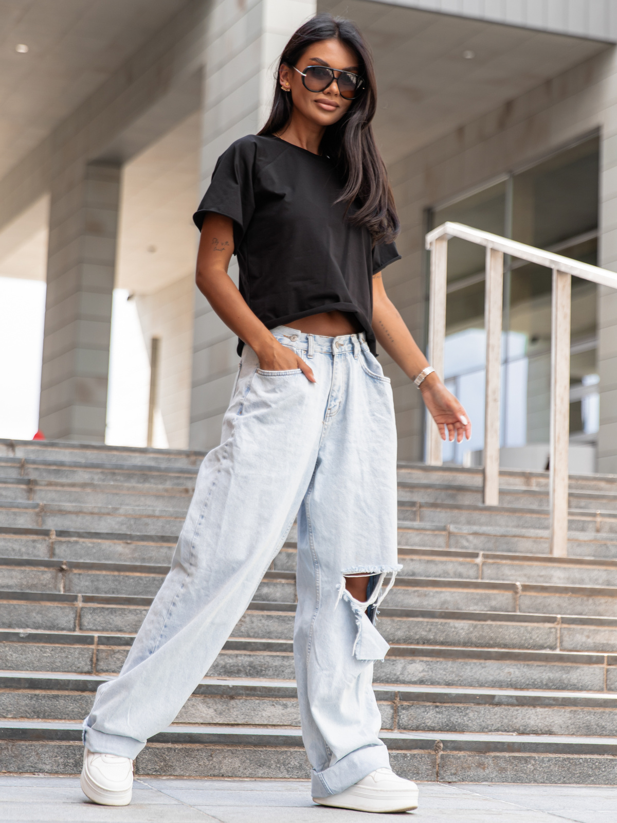 Bluzka: luźny krój, krótki rękaw, dół i mankiety wykończone na surowo, bawełna z elastanem.