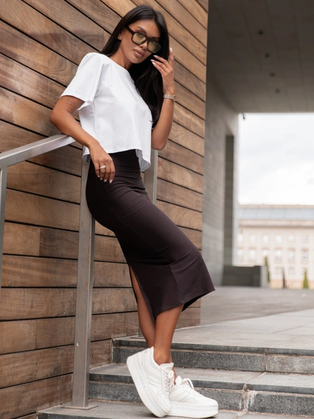 Spódnica: obcisła midi, praktyczny rozporek, elastyczna dzianina przyjemna w dotyku.