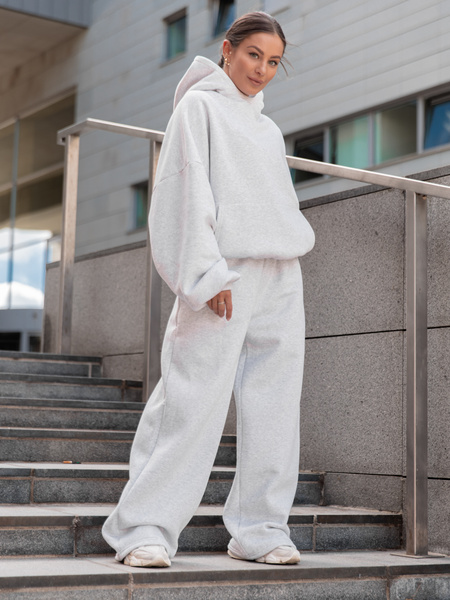 • Zestaw łączy klasyczną bluzkę z długim rękawem, bez dekoltu, o średnio dopasowanym fasonie, z luźnymi spodniami baggy z gumką w pasie i rozszerzoną nogawką.