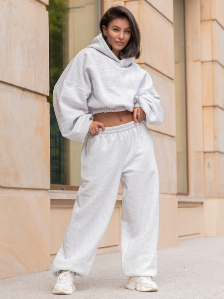 Kompletny zestaw uszyty z wysokiej jakości bawełnianej dzianiny dresowej drapanej od wewnątrz, która jest wyjątkowo przyjemna w noszeniu i otula ciepłem. W skład kompletu wchodzi nasza viralowa, oversize’owa bluza kangurka z kapturem oraz luźne spodnie baggy z gumką w pasie i na nogawkach.