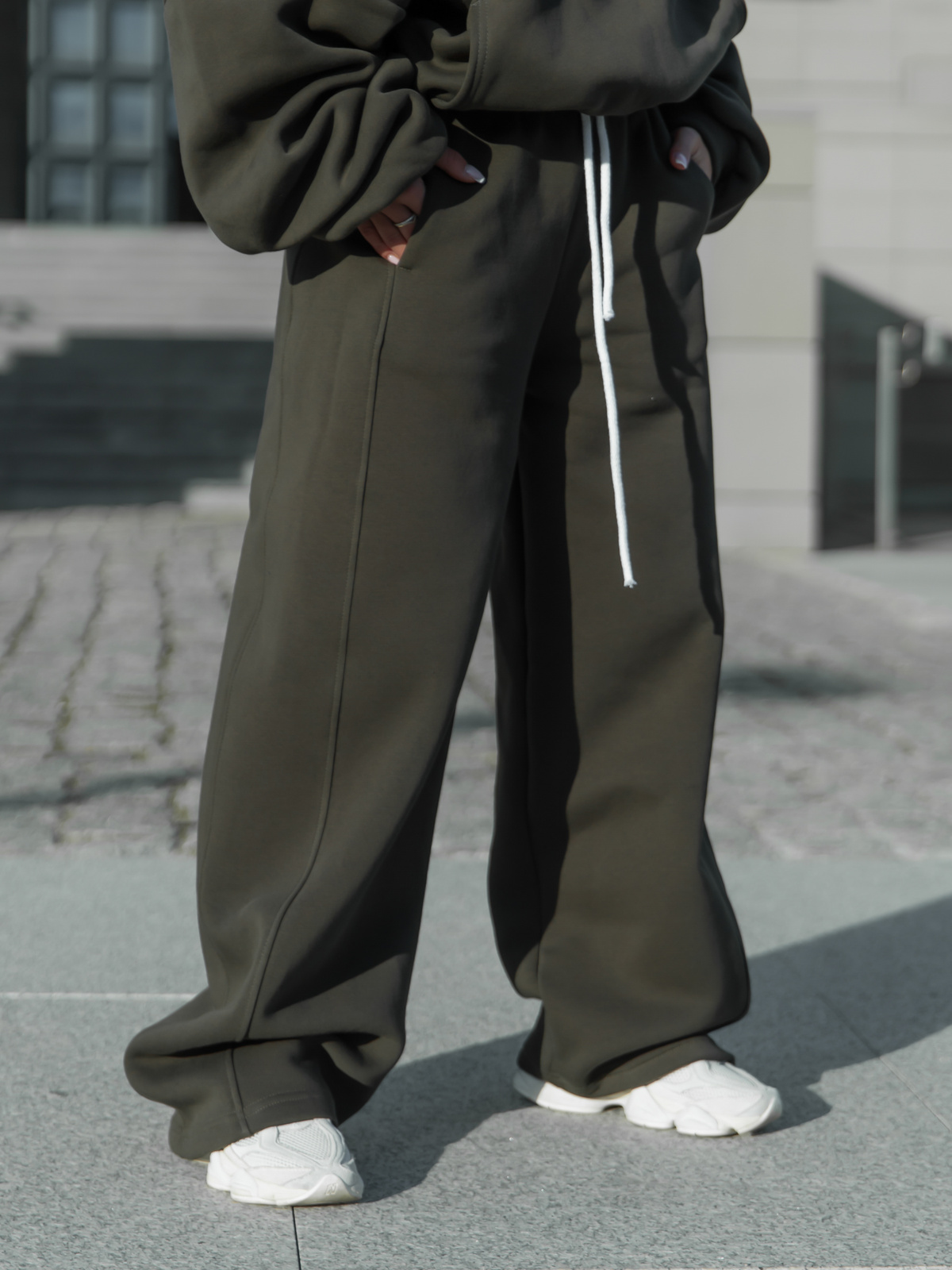 Dresowe bawełniane SPODNIE oversize ze średnim stanem z przeszyciami dark khaki X401