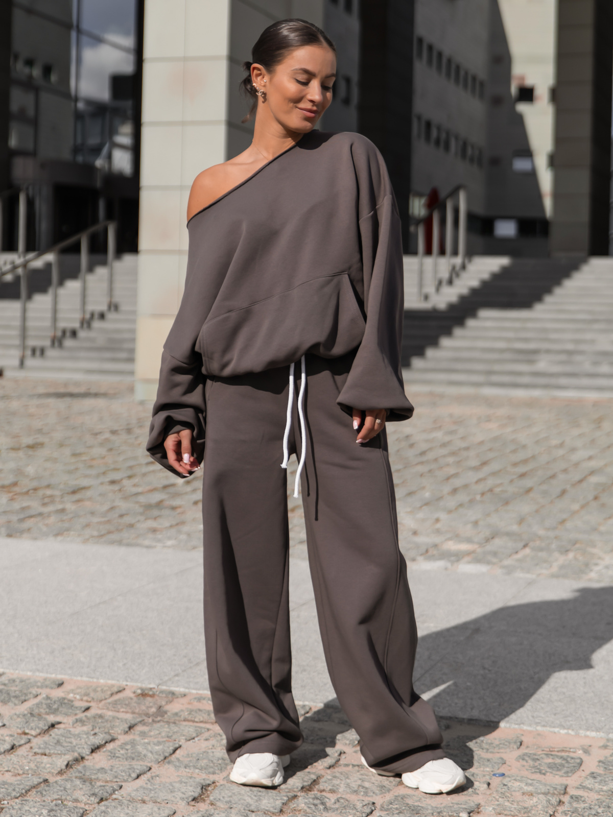 Oversizowy ZESTAW: Dresowa BLUZA opuszczana na ramiona X400 + Dresowe SPODNIE oversize ze średnim stanem z przeszyciami X401