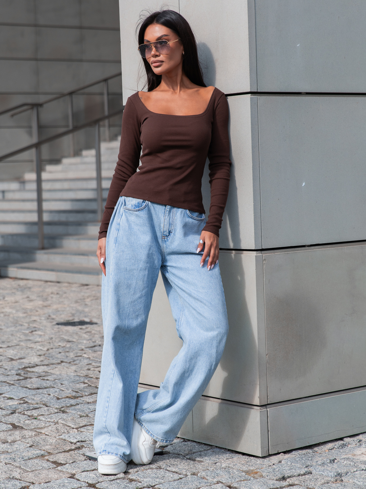 Basic Bawełniana BLUZKA z prążkowanej dzianiny z kwadratowym dekoltem brązowa X406