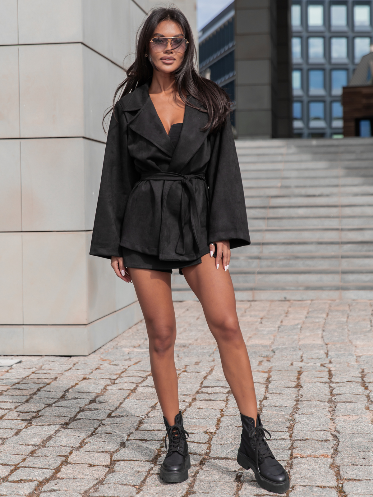 Oversizowa zamszowa MARYNARKA o szerokim kroju z paskiem czarna X409