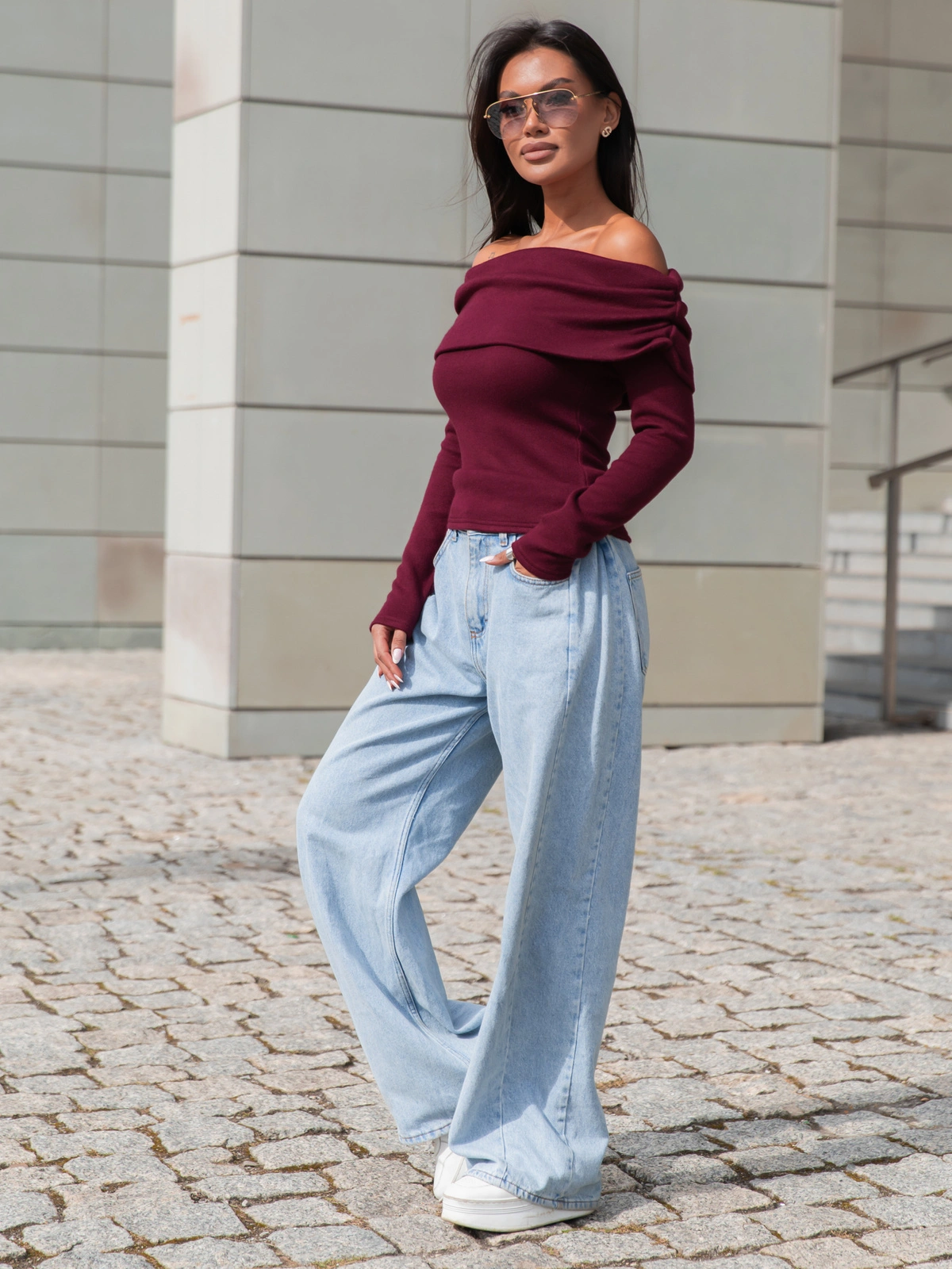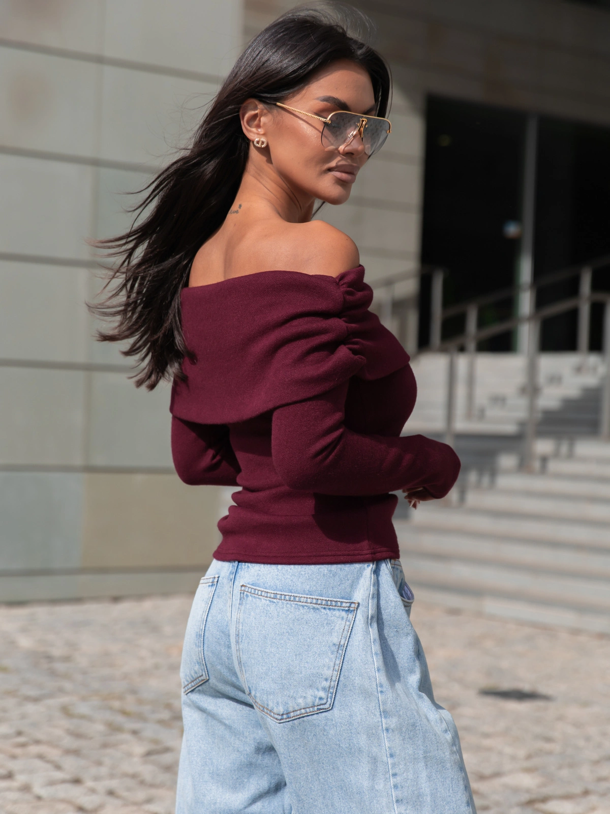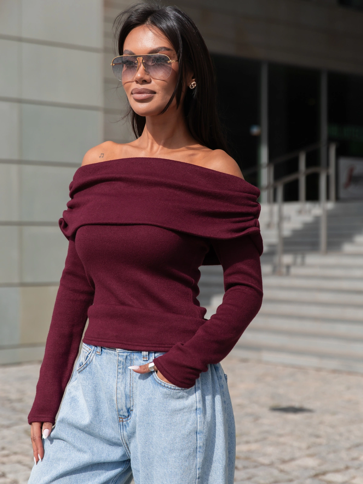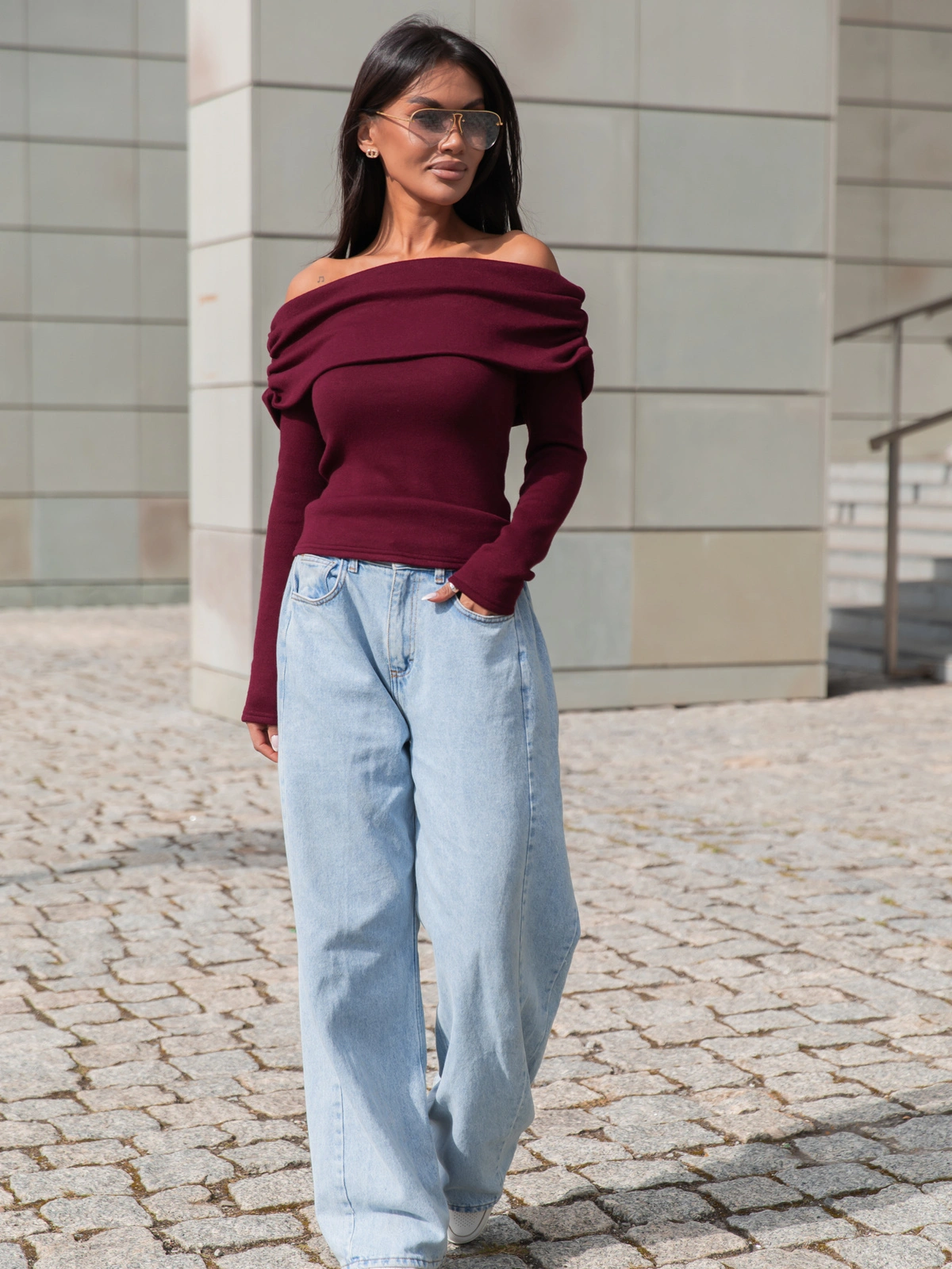 Dopasowany codzienny SWETER o klasycznym splocie opuszczany na ramiona bordowy X411 k01
