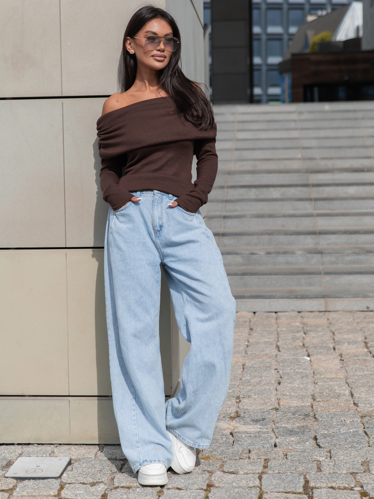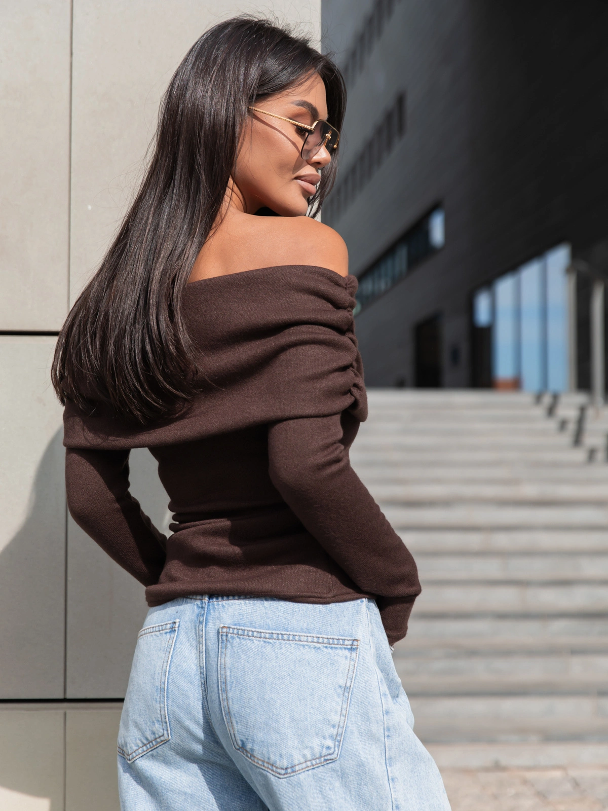Dopasowany codzienny SWETER o klasycznym splocie opuszczany na ramiona brązowy X411 k01