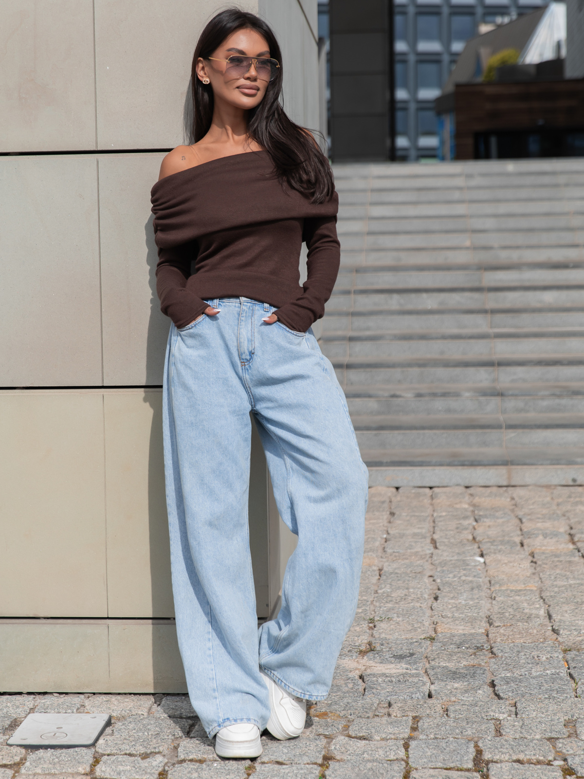 Dopasowany codzienny SWETER o klasycznym splocie opuszczany na ramiona brązowy X411