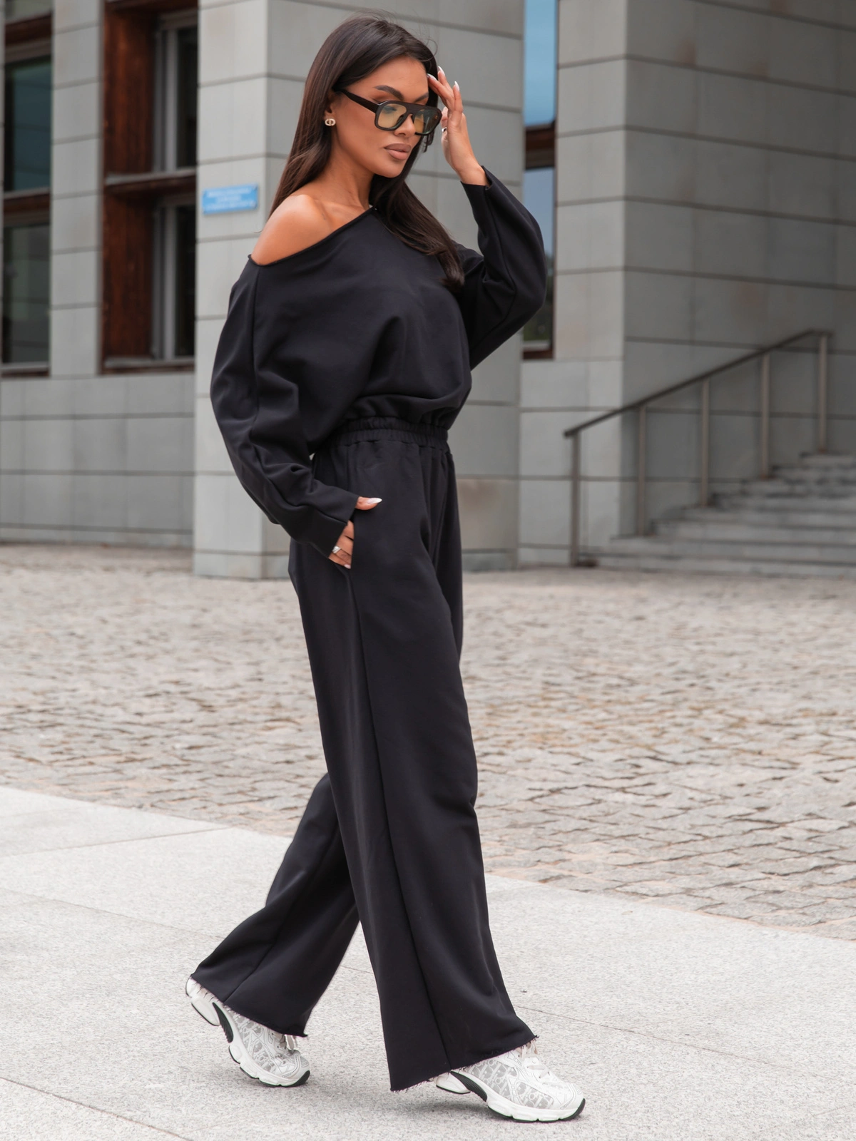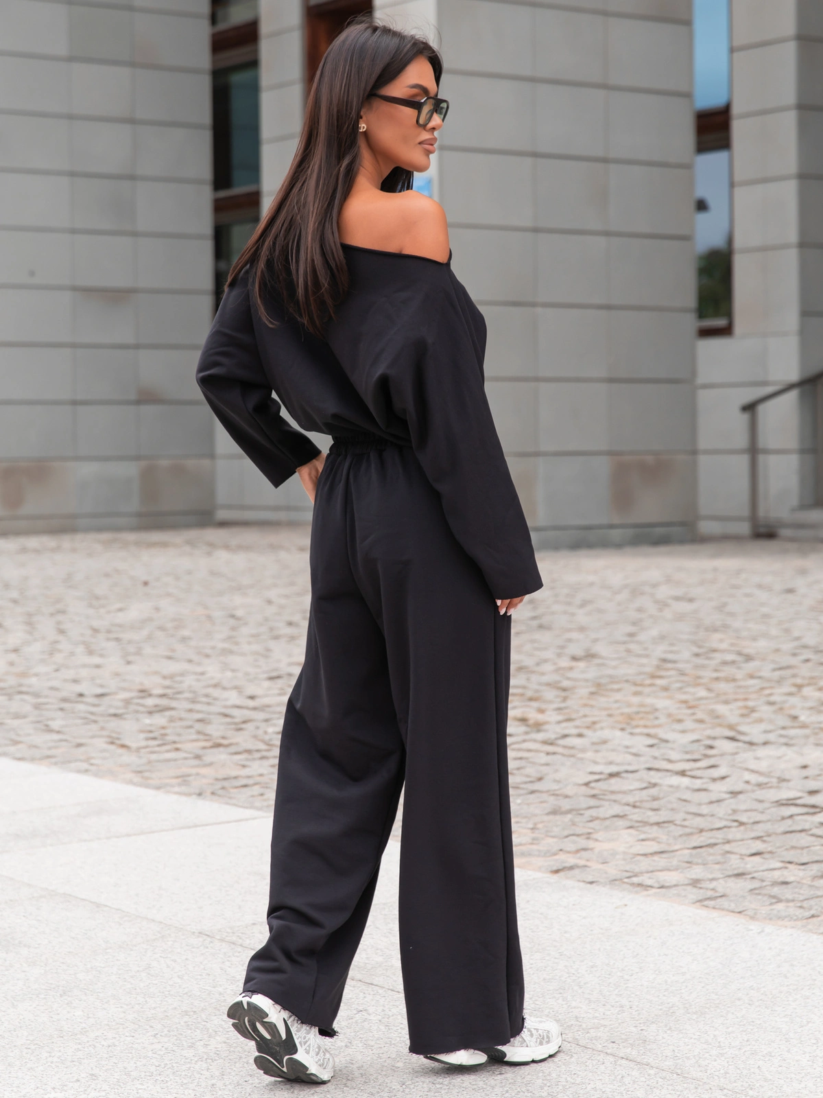 Model posiada długie rękawy oraz lużne długie spodnie, które gwarantują pełną swobodę ruchów i komfort nawet podczas aktywnego wypoczynku. Górna część kombinezonu została zaprojektowana z dekoltem opuszczanym na ramiona, co dodaje stylizacji lekkości oraz subtelnej zmysłowości. Mankiety i dekolt nie obszyty , wykończony na surowo .