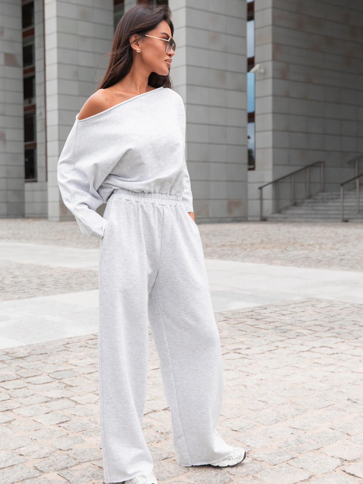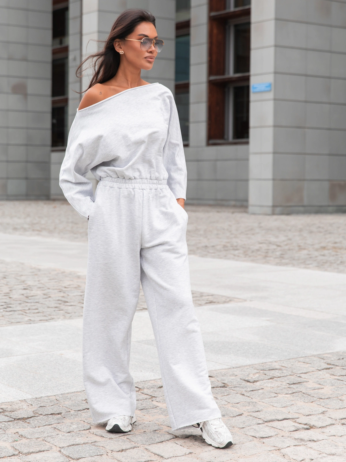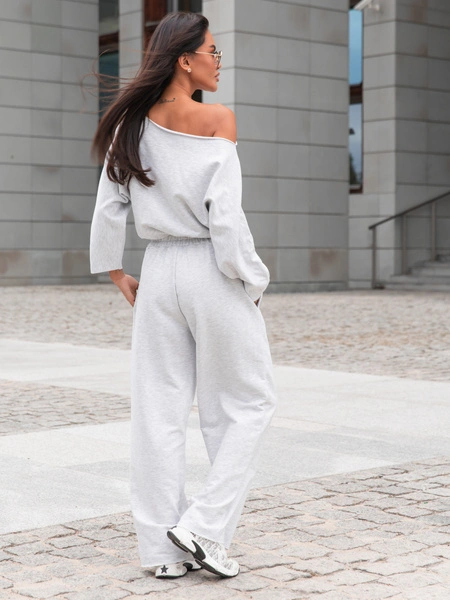 Model posiada długie rękawy oraz lużne długie spodnie, które gwarantują pełną swobodę ruchów i komfort nawet podczas aktywnego wypoczynku. Górna część kombinezonu została zaprojektowana z dekoltem opuszczanym na ramiona, co dodaje stylizacji lekkości oraz subtelnej zmysłowości. Mankiety i dekolt nie obszyty , wykończony na surowo .