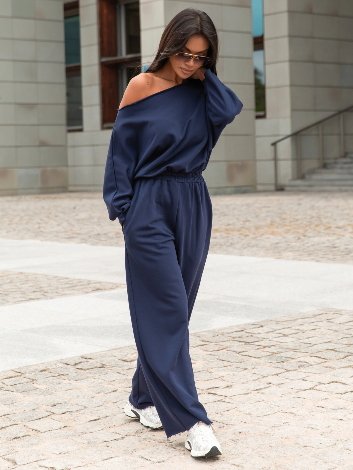Model posiada długie rękawy oraz lużne długie spodnie, które gwarantują pełną swobodę ruchów i komfort nawet podczas aktywnego wypoczynku. Górna część kombinezonu została zaprojektowana z dekoltem opuszczanym na ramiona, co dodaje stylizacji lekkości oraz subtelnej zmysłowości. Mankiety i dekolt nie obszyty , wykończony na surowo .