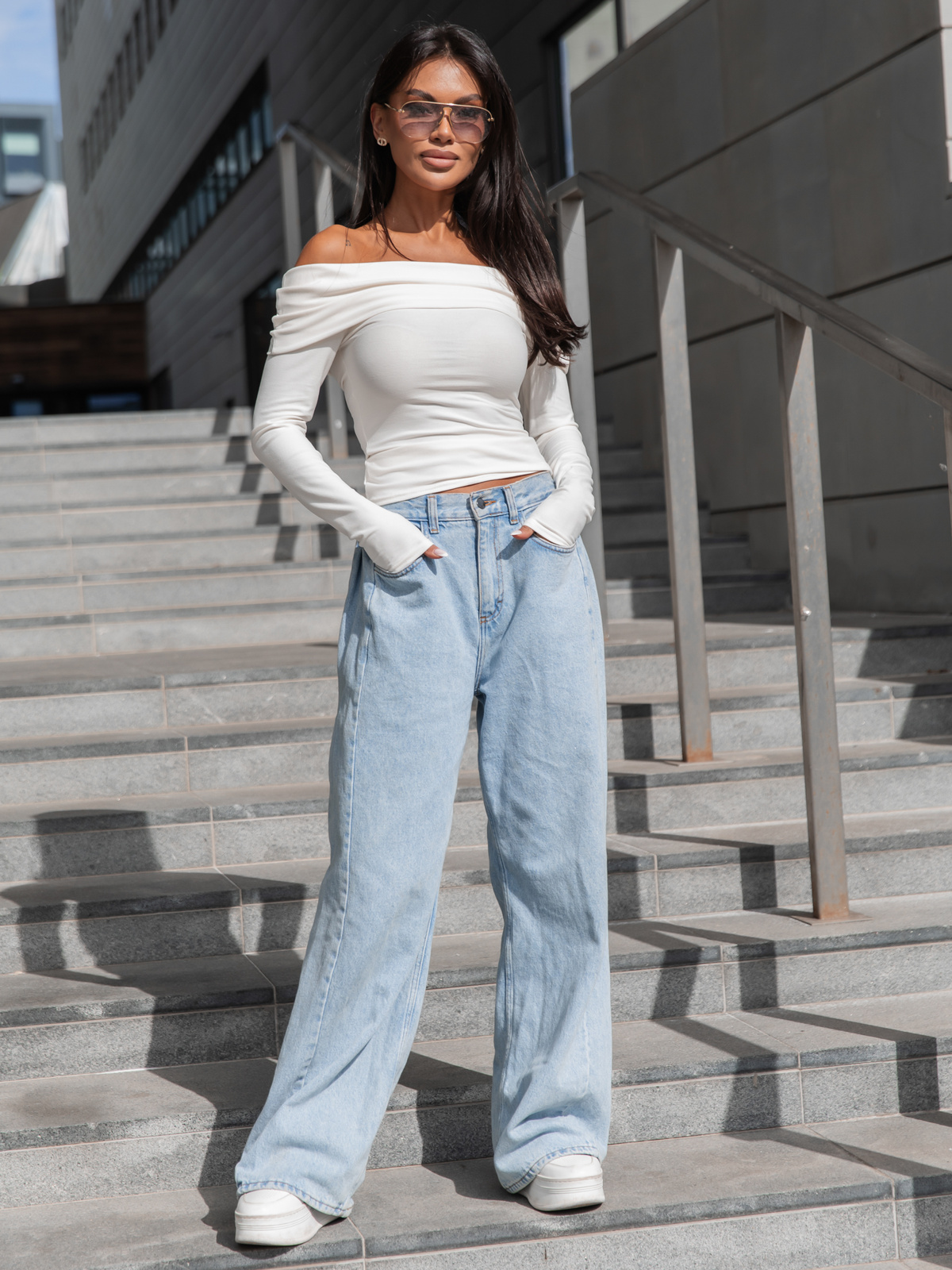 Dopasowana bluzka – klasyka która nie wychodzi z mody . Odkryte ramiona , z opuszczanym szalem , z długim rękawem .