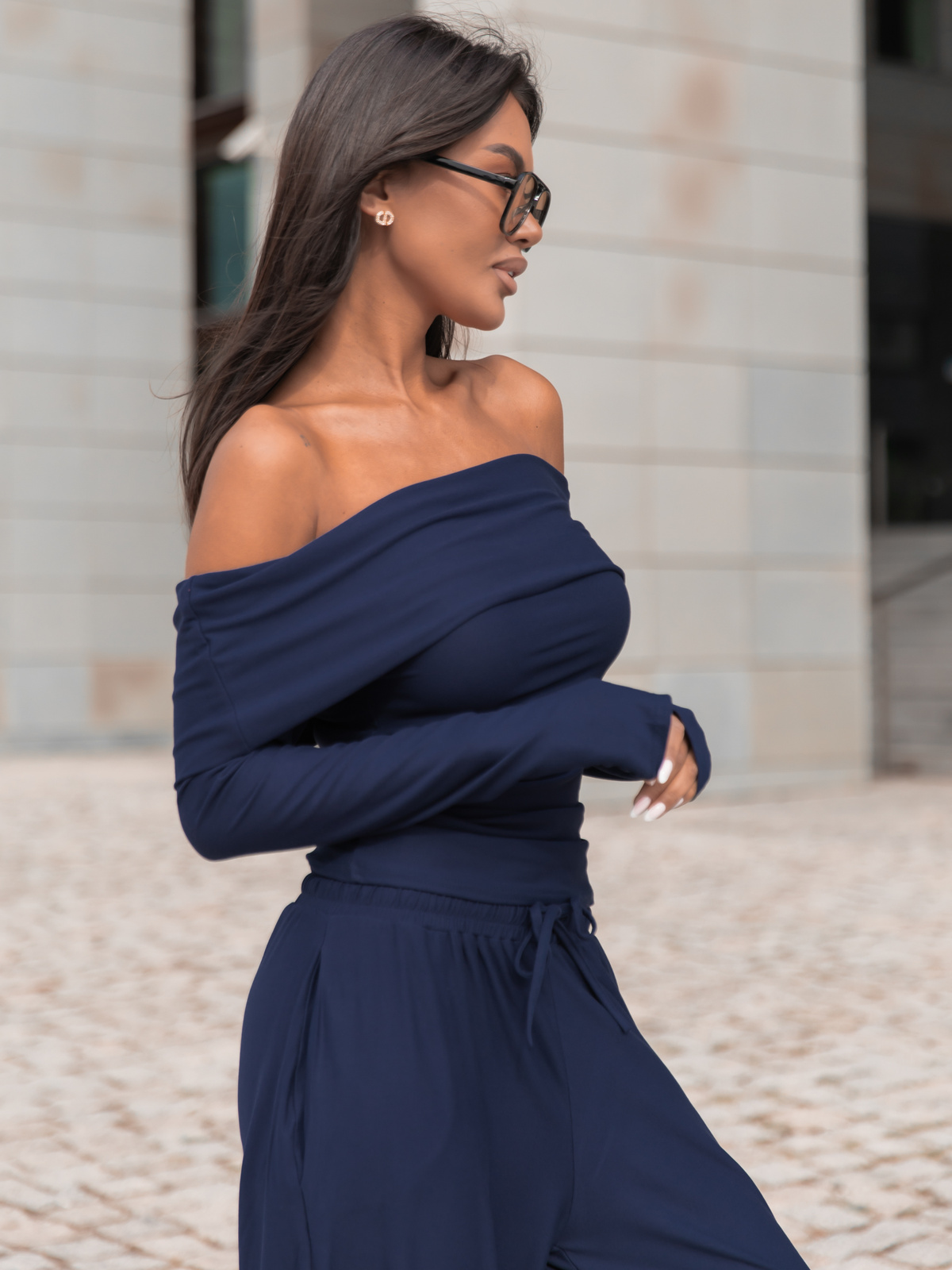 Wiscozowa dopasowana BLUZKA opuszczana na ramiona z długim rękawem navy blue X416