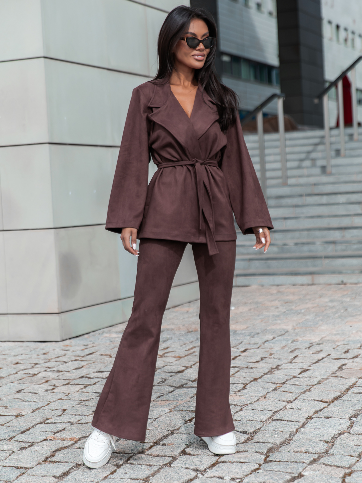 Zestaw z miękkiego i elastycznego zamszu składający się z oversize’owej kurtki / marynarki oraz krótkich spódnico-spodenek. Kurtka ma kołnierz, nie posiada zapięcia i jest przewiązywana paskiem z tego samego materiału, co nadaje jej swobodny, ale elegancki charakter. Spódnico-spodenki z subtelnym rozporkiem doskonale uzupełniają całość, tworząc spójny i stylowy komplet.