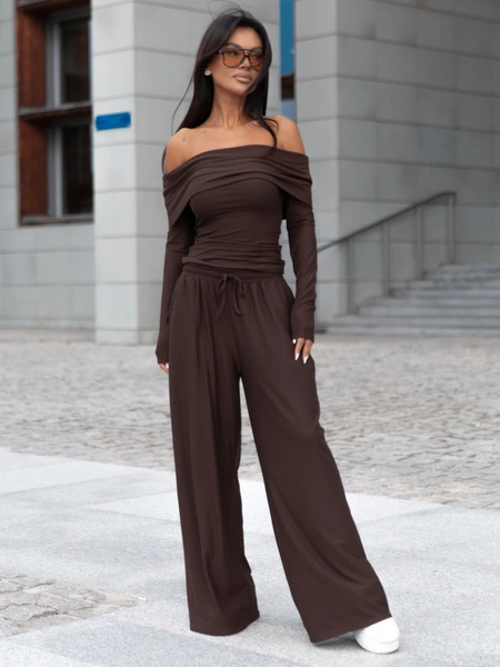 Spodnie o swobodnym kroju gwarantują wygodę i pełną swobodę ruchów, a ich średni stan pasuje do różnych typów sylwetki. Dopasowana bluzka z długim rękawem i odkrytymi ramionami to kobiecy i ponadczasowy element garderoby, który nadaje stylizacji elegancki charakter.