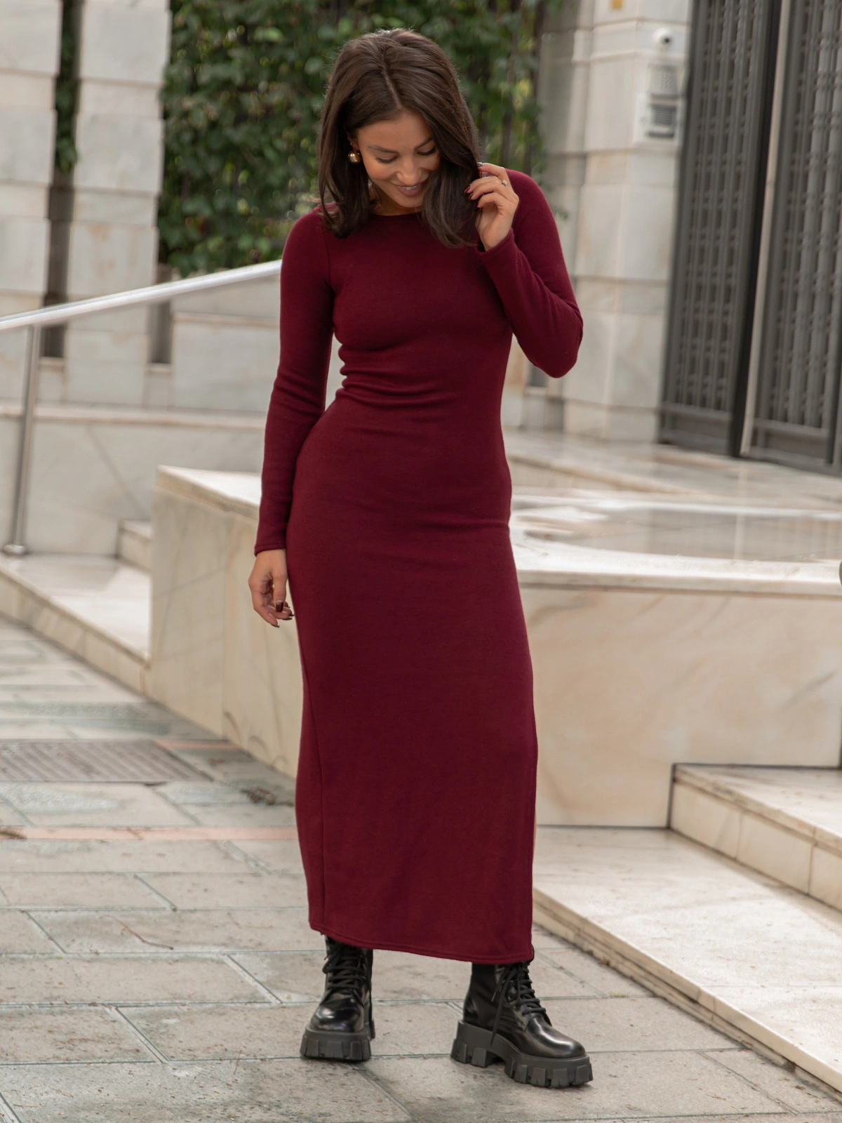 Dopasowana SUKIENKA maxi z rozporkiem z dzianiny swetrowej bordowy X451 k01