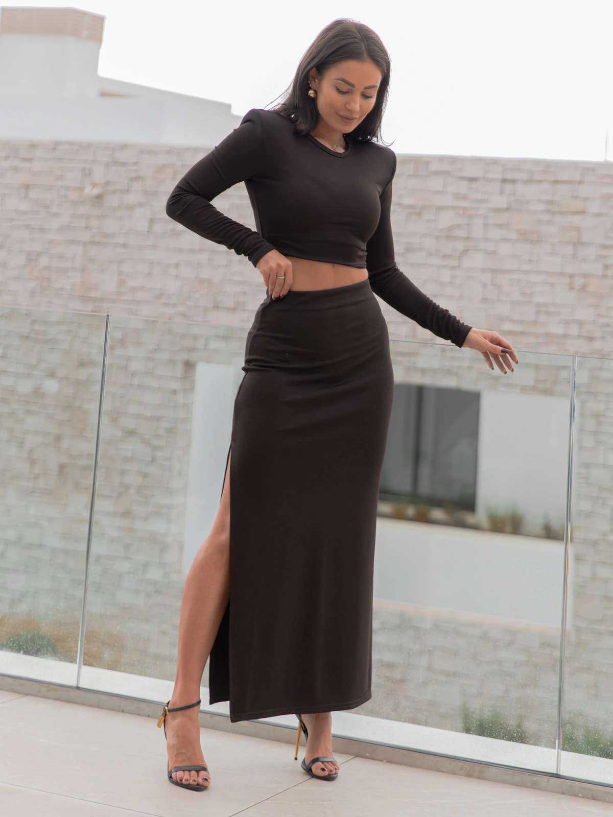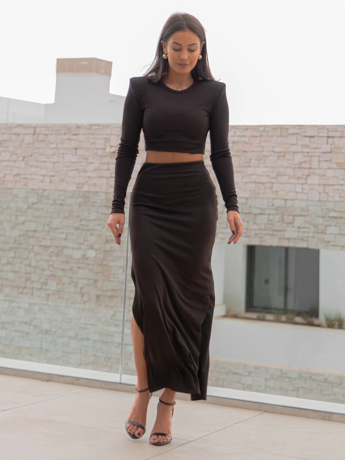 Elegancki KOMPLET krótka bluzka z poduszkami na ramionach i spódnica maxi z rozporkiem czekoladowy X455 k01