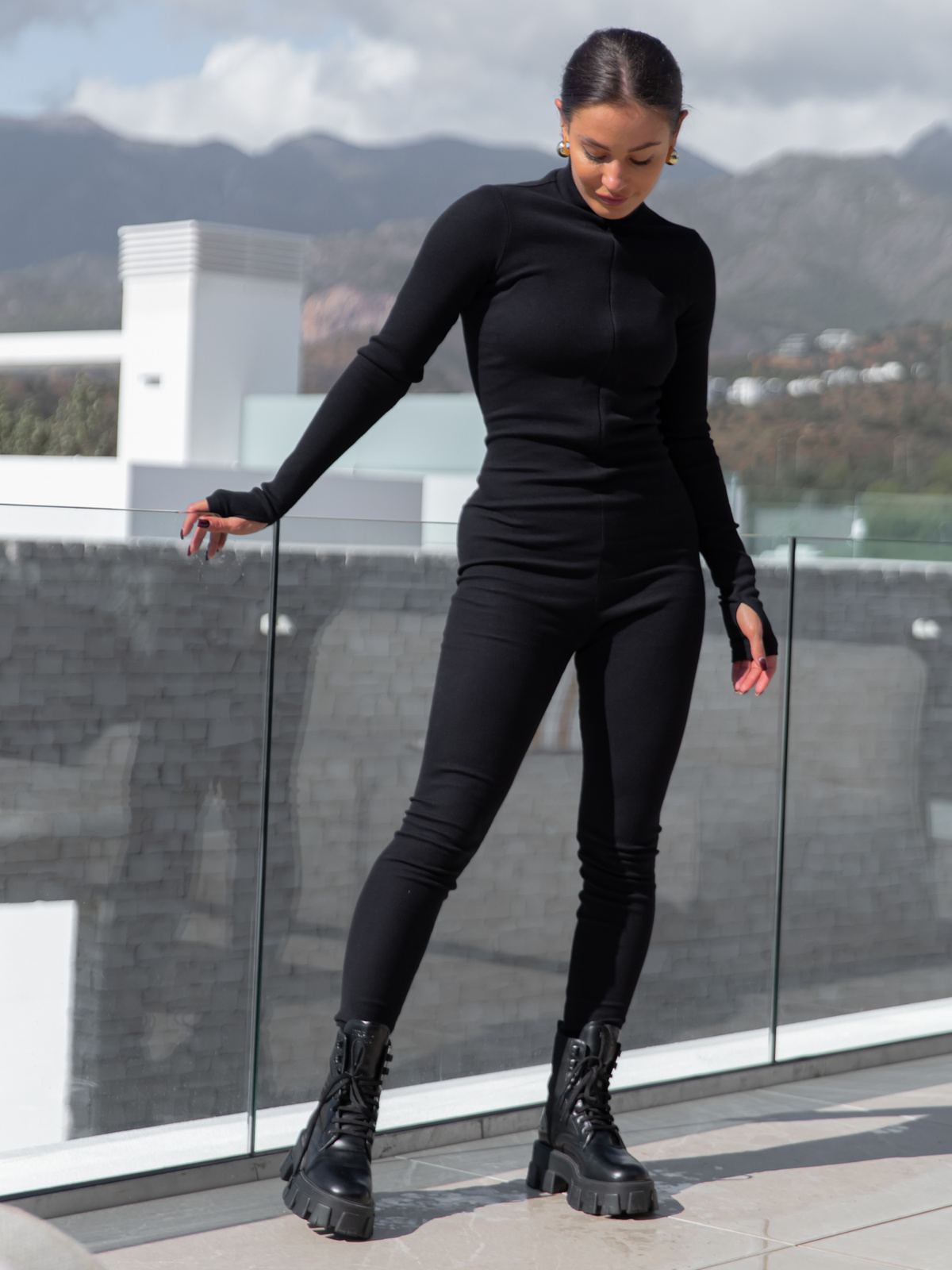 Bawełniany dopasowany KOMBINEZON z dzianiny prążkowanej na stójce zapinany na zamek czarny X458
