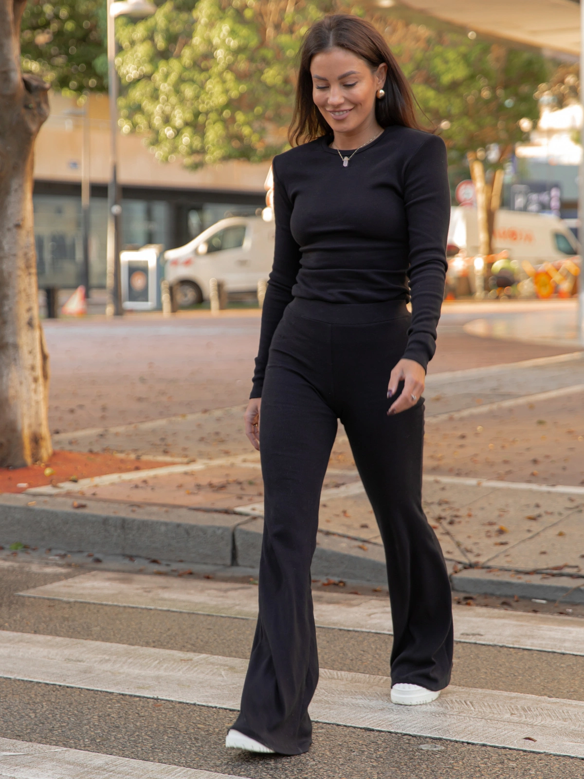 Opinie o Bawełniane dopasowane SPODNIE z szerokimi nogawkami z dzianiny prążkowanej czarne X466