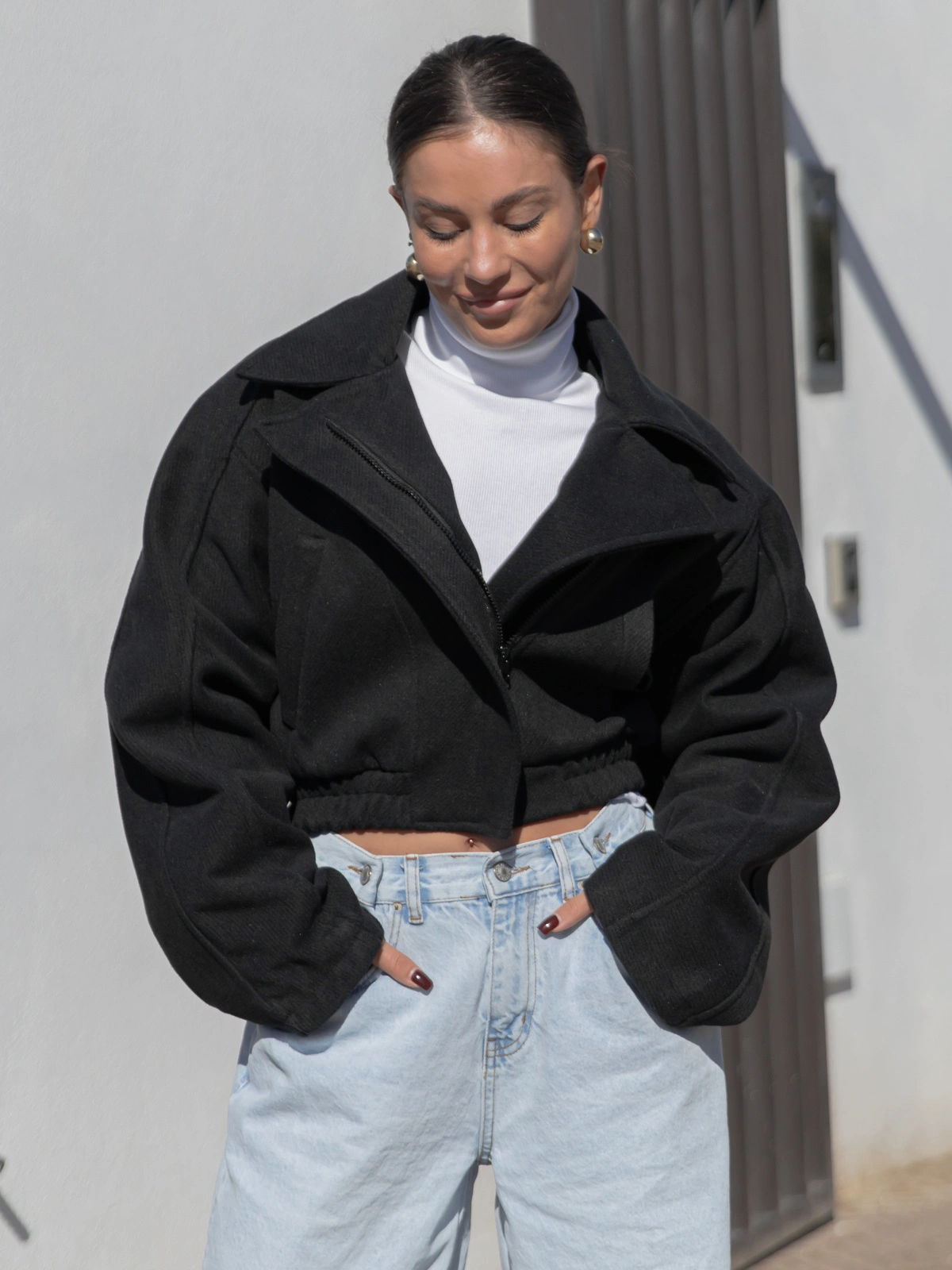 • Krótka, oversize’owa kurtka na ściągaczu – dzięki wszytej gumce możesz dopasować ją do sylwetki i nosić na różne sposoby. Zapinana na zamek, z klasycznym kołnierzem.