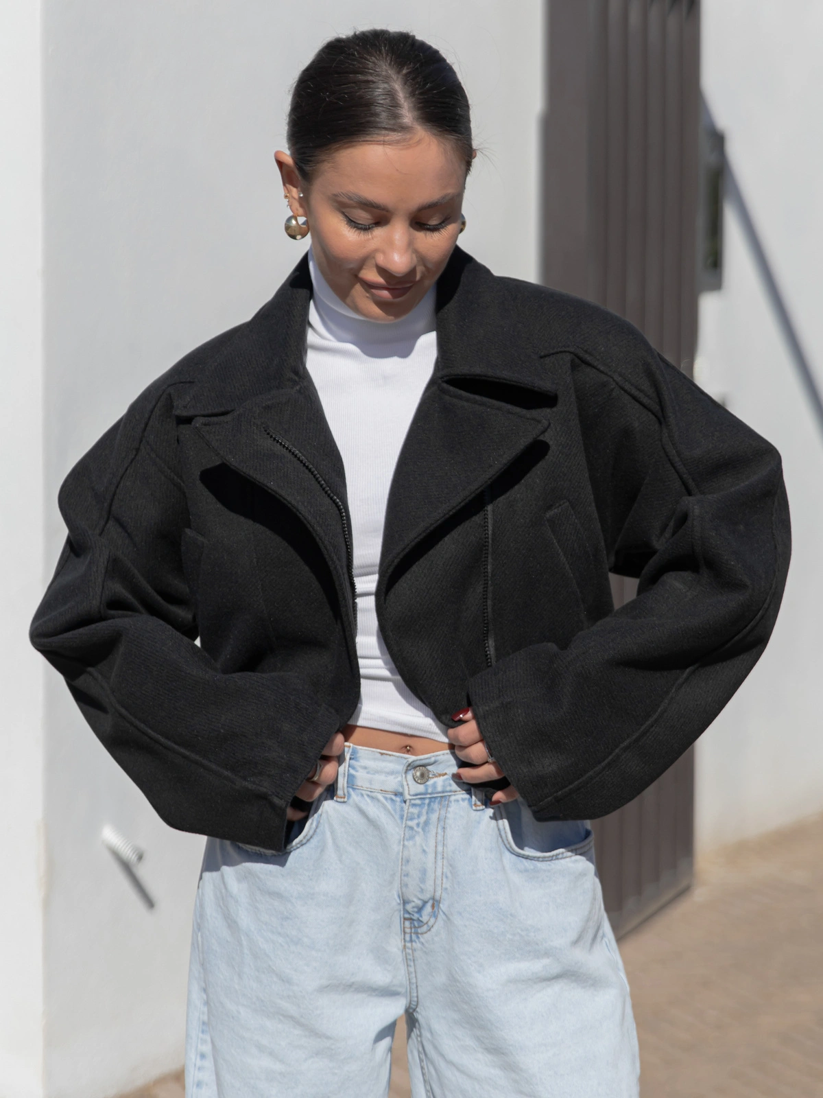 Oversizowa krótka KURTKA o szerokim kroju ramoneska czarna X468 k01