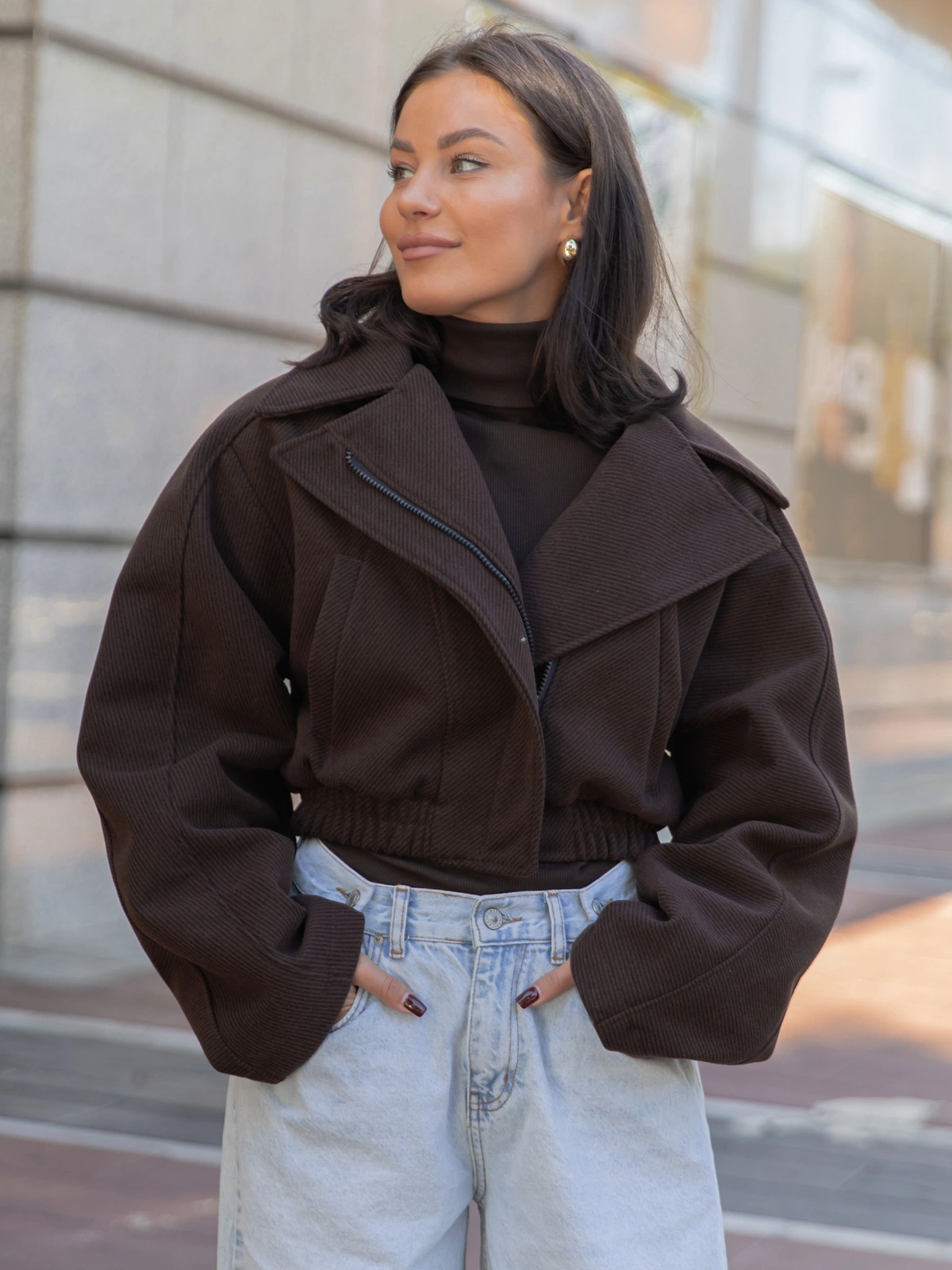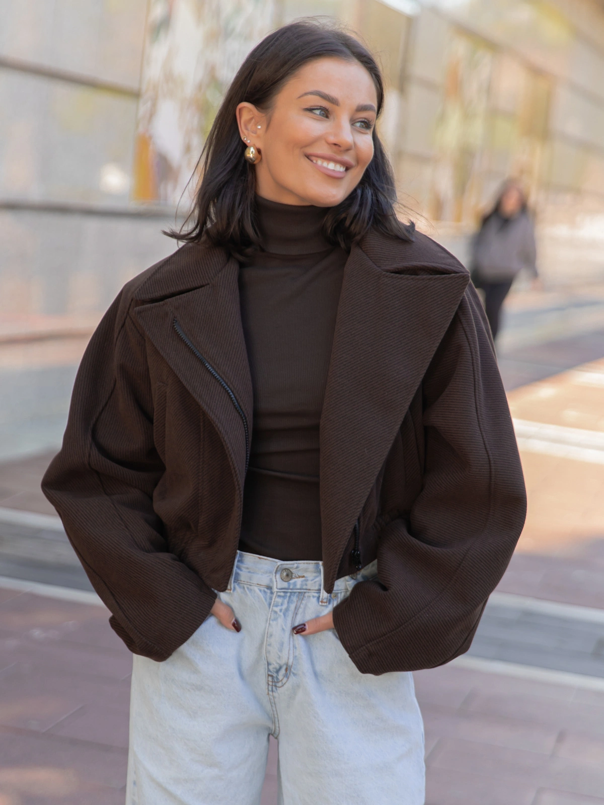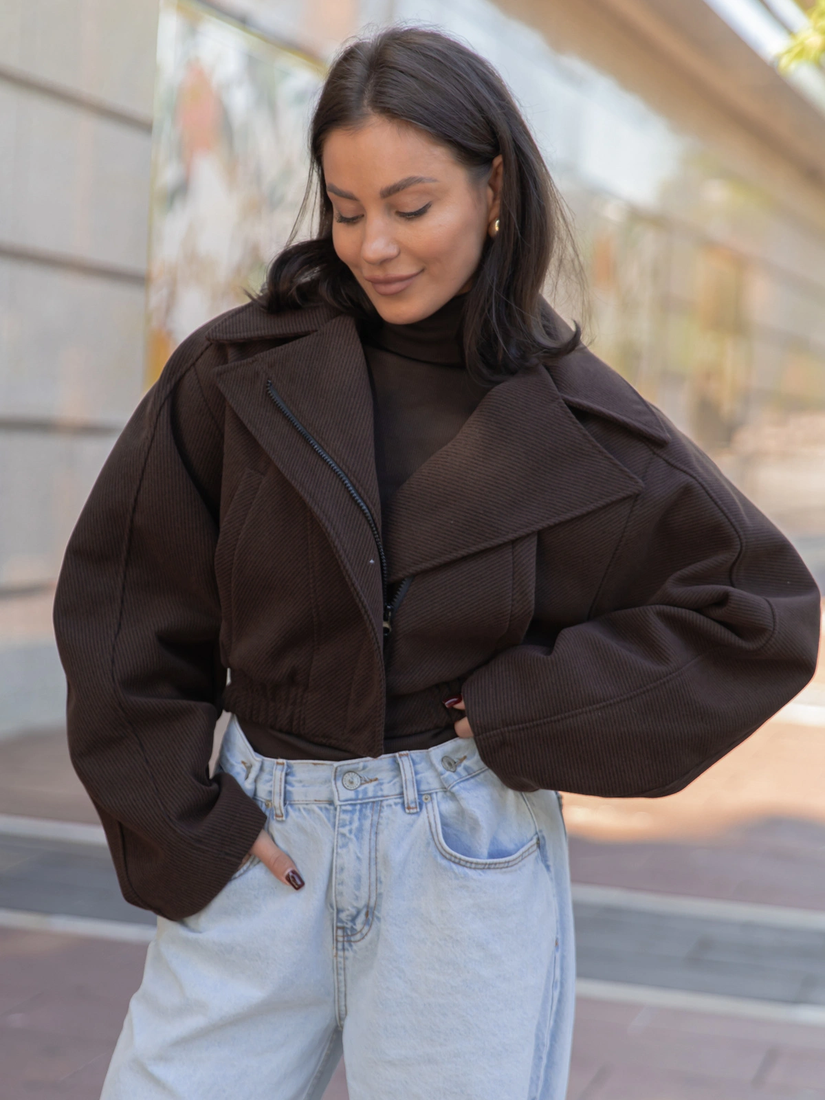 Oversizowa krótka KURTKA o szerokim kroju ramoneska czekoladowa X468 k01