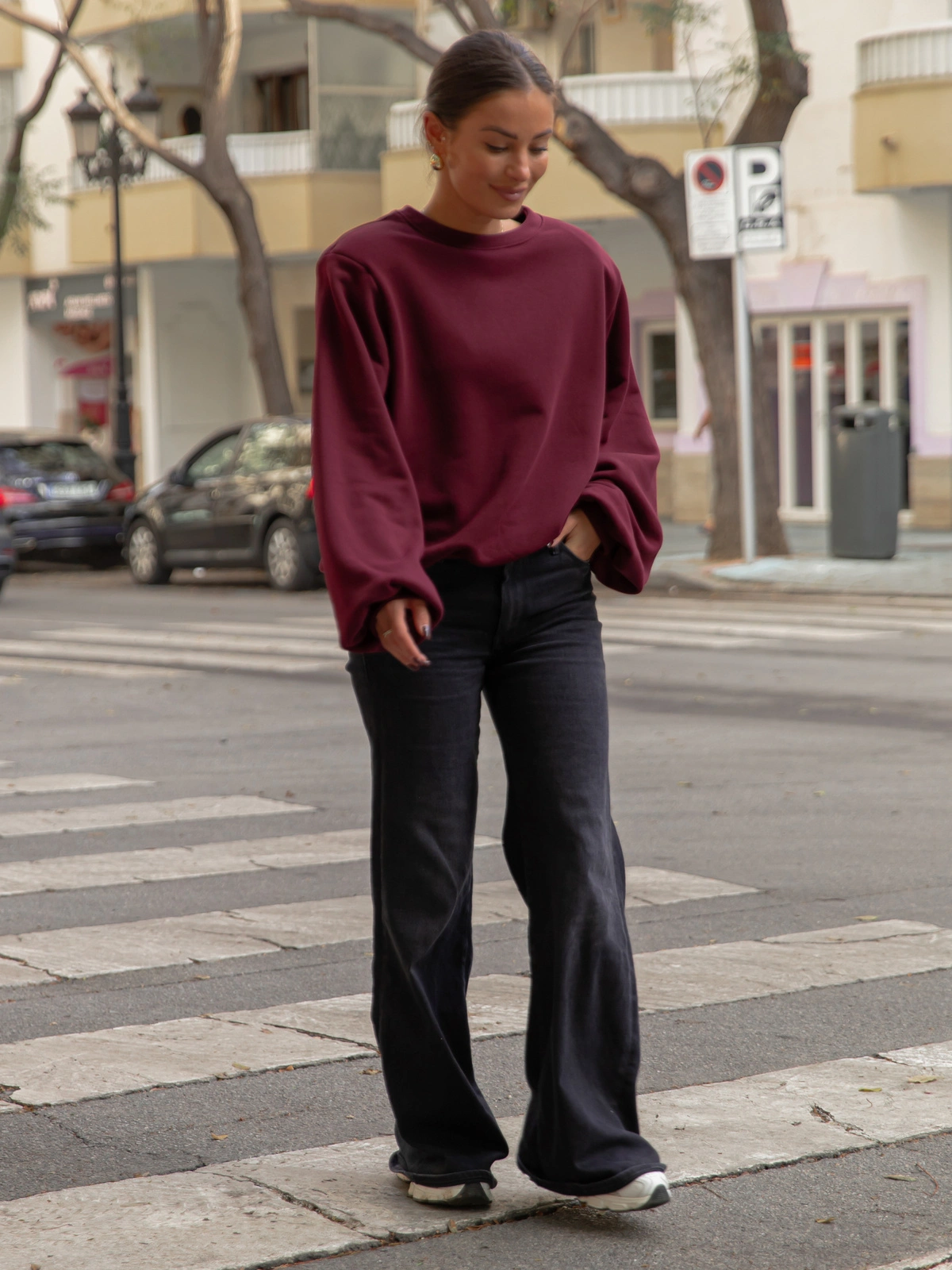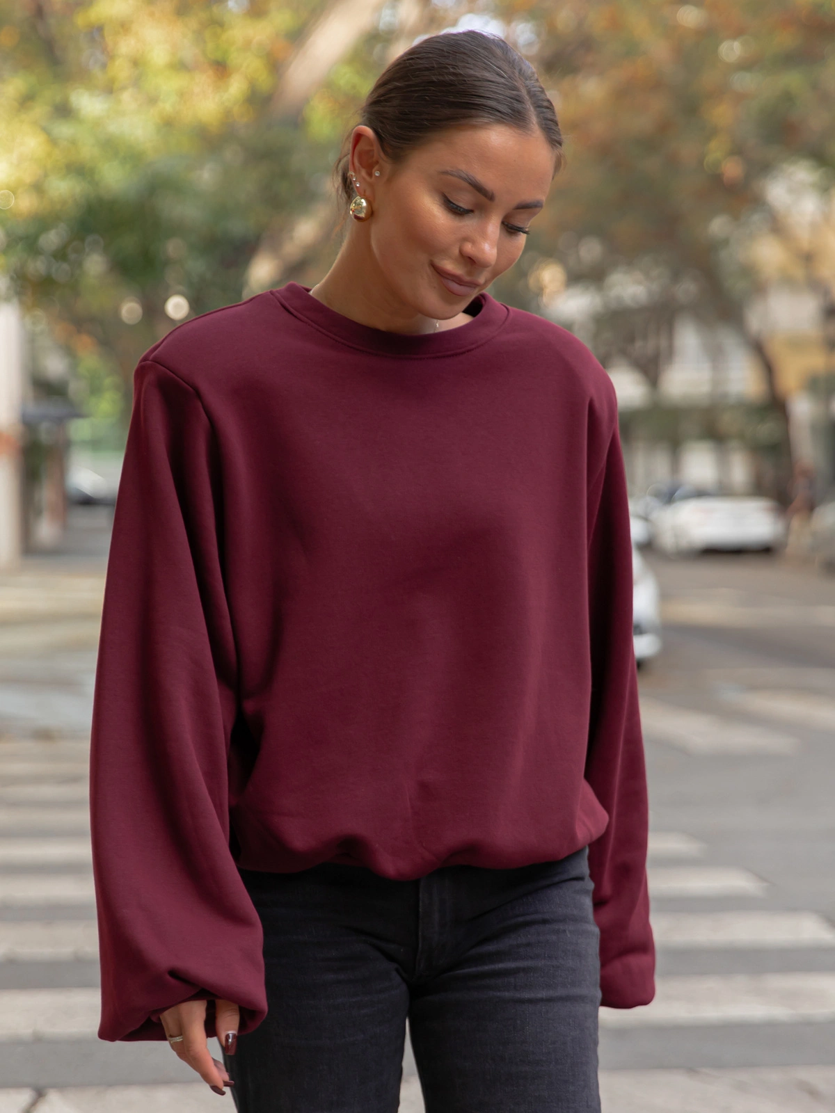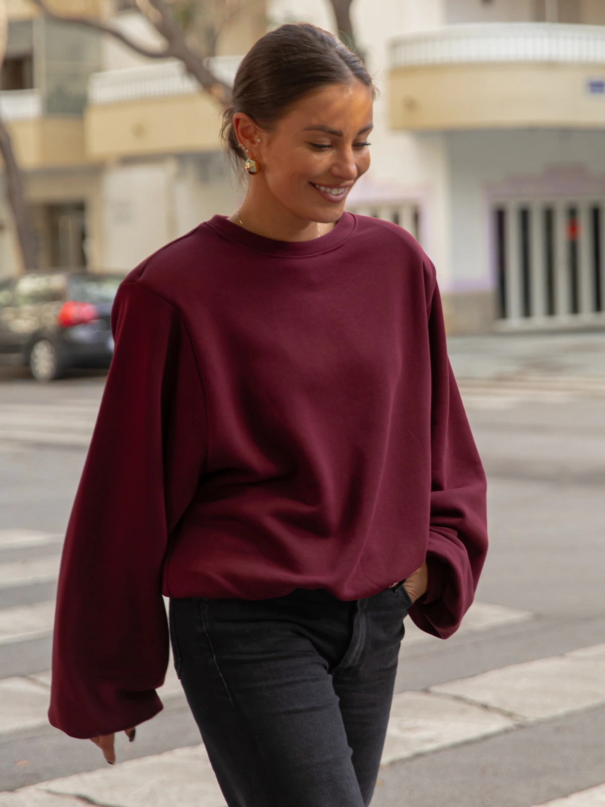 Oversizowa bawełniana BLUZA z drapanego dresu z poduszkami na ramionach bordowa X469 k01